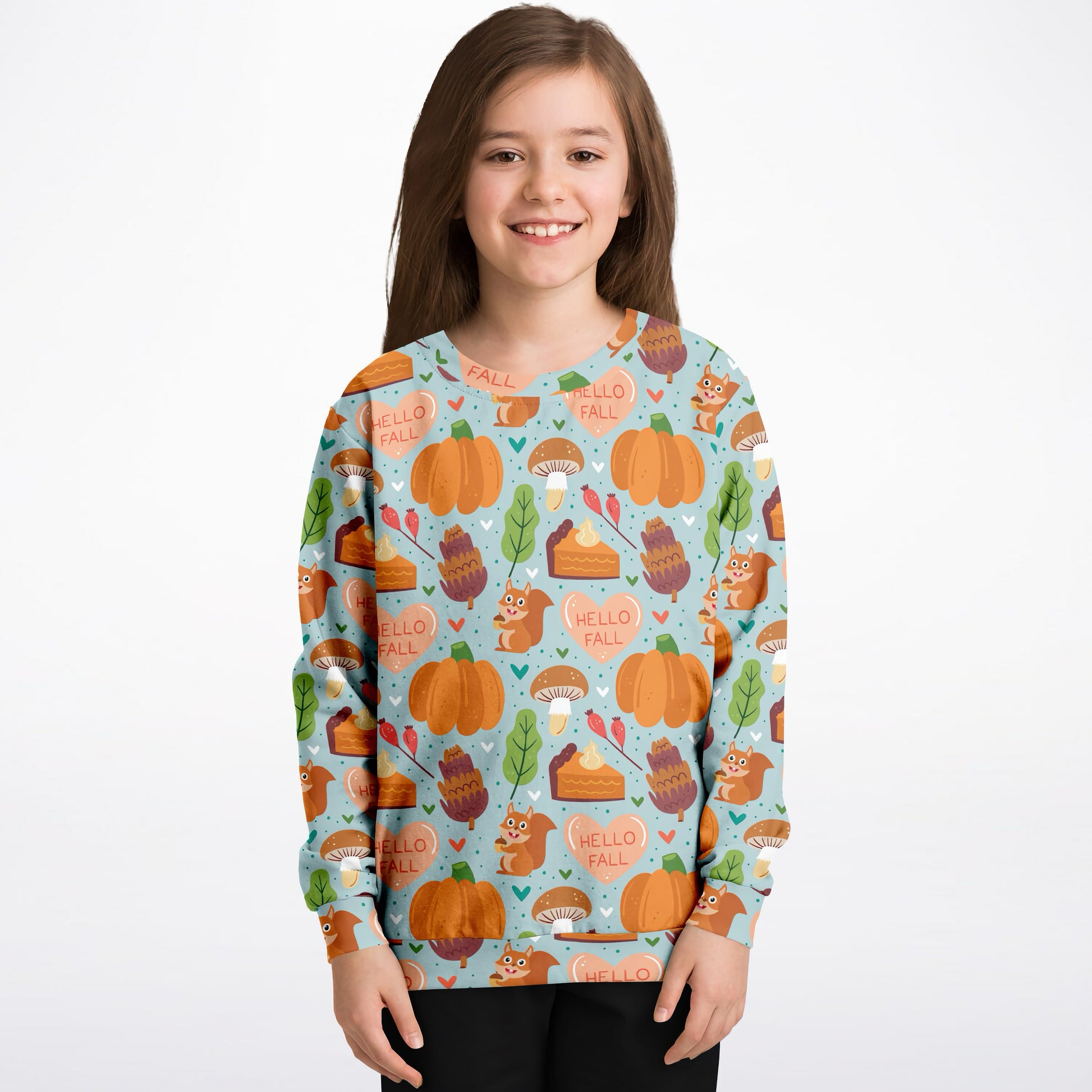 Kids 'Hello Fall' Autumn Themed Sweatshirt – Cozy Cotton Fleece or Lightweight Sports Fabric