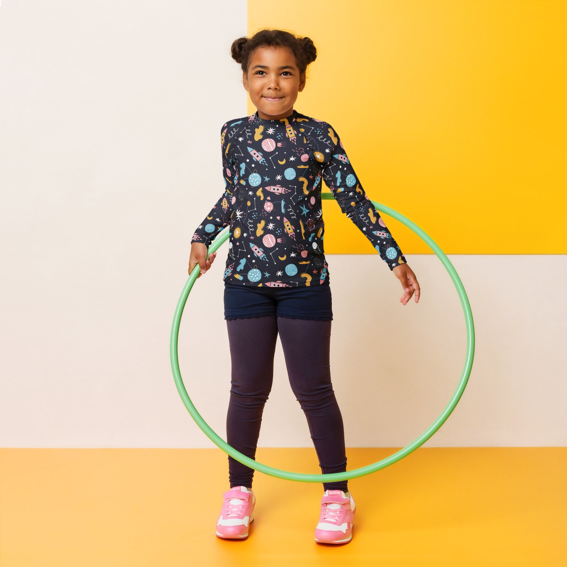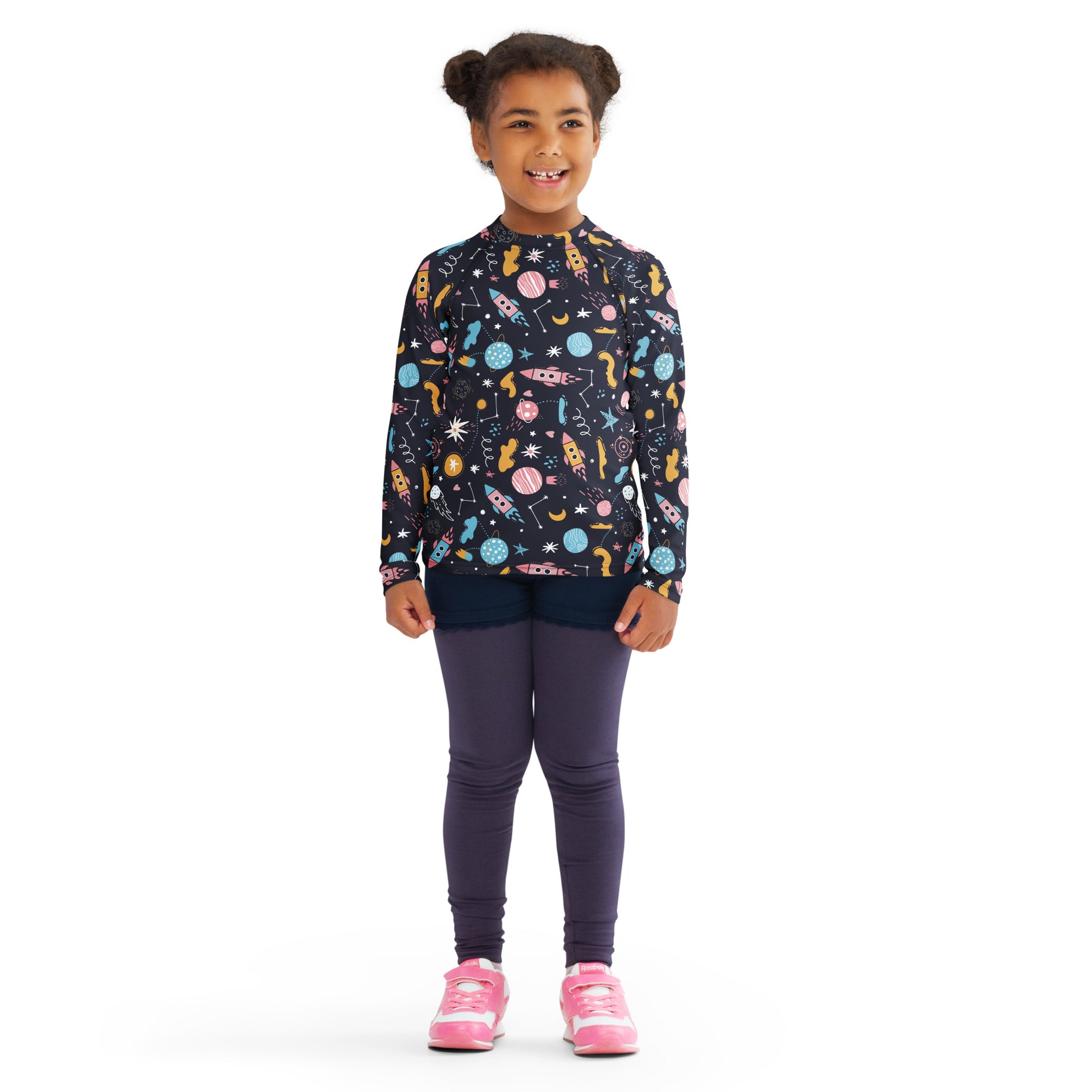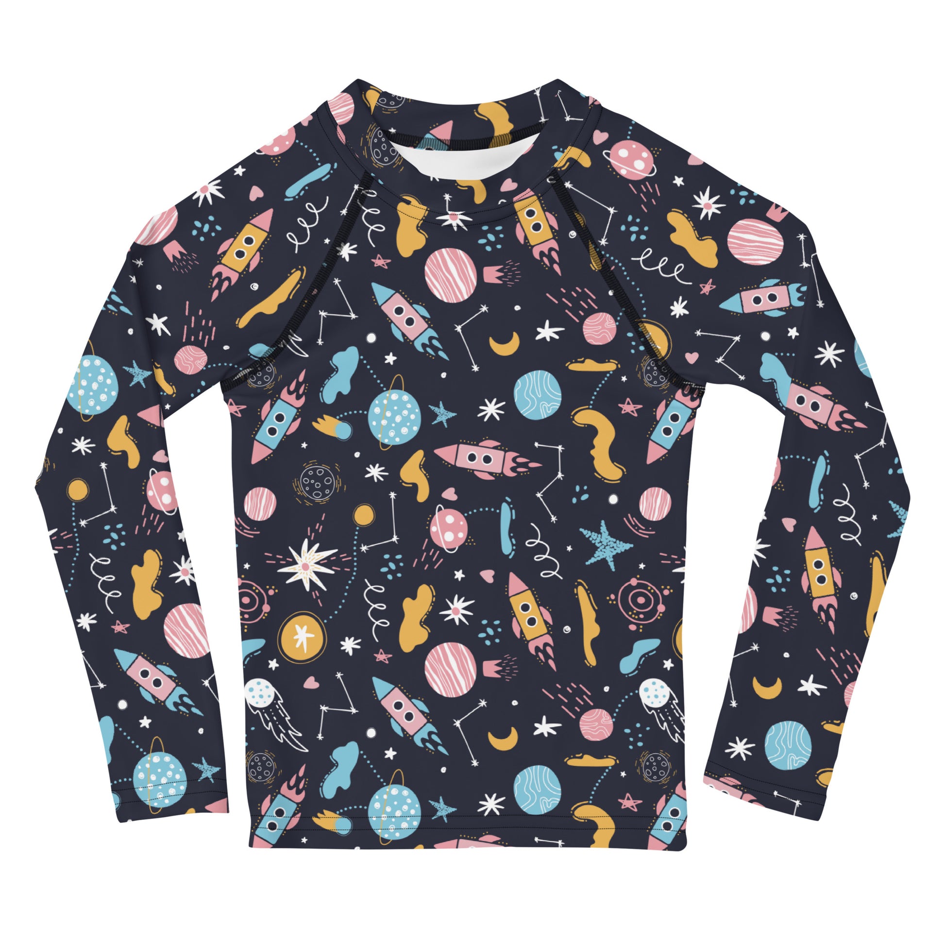 Get your toddler or young explorer ready for aquatic adventures with this kids space rash guard featuring rockets, planets, stars and more. Designed to provide maximum comfort and protection, this swim top is perfect for sunny pool days, beach outings, or any water-filled fun.