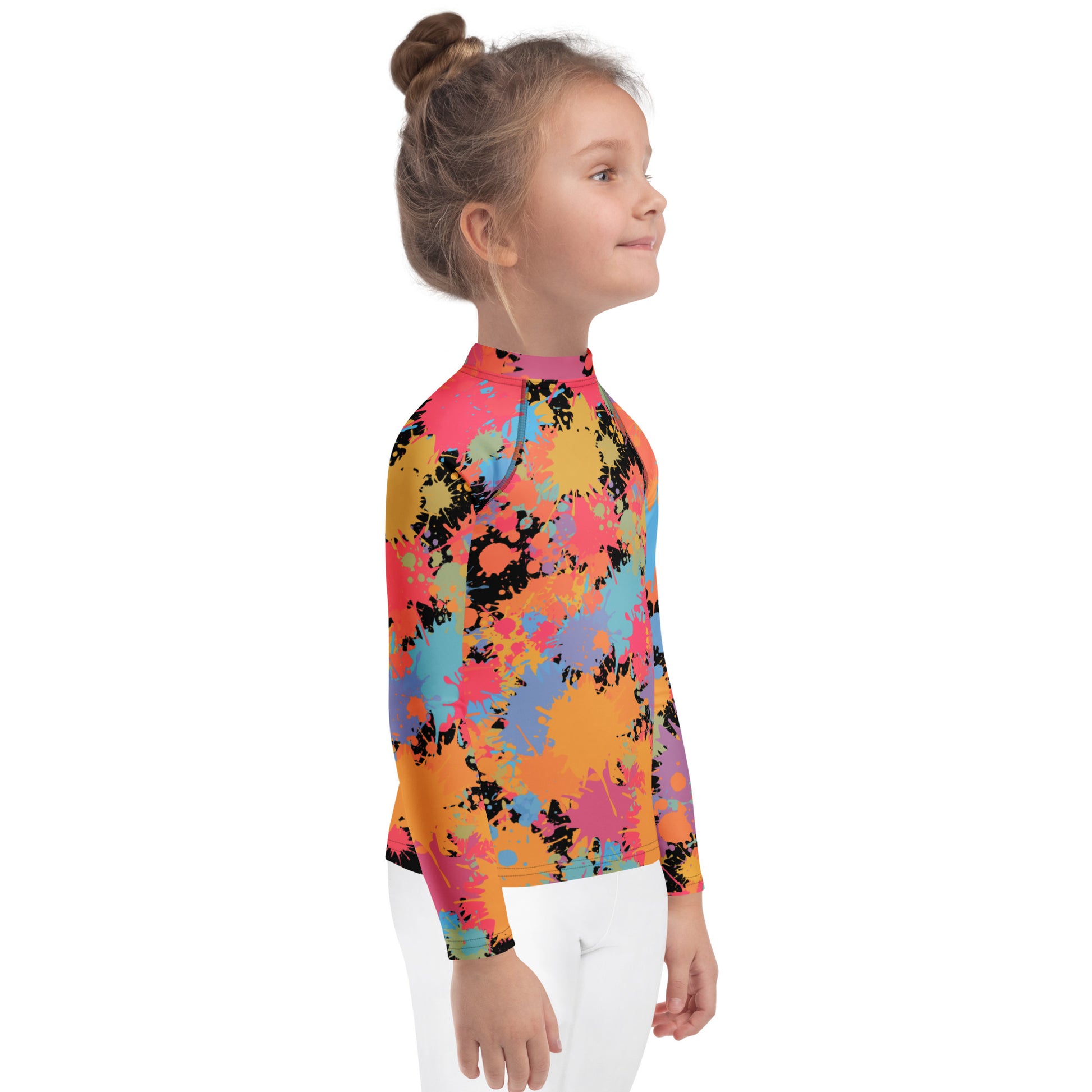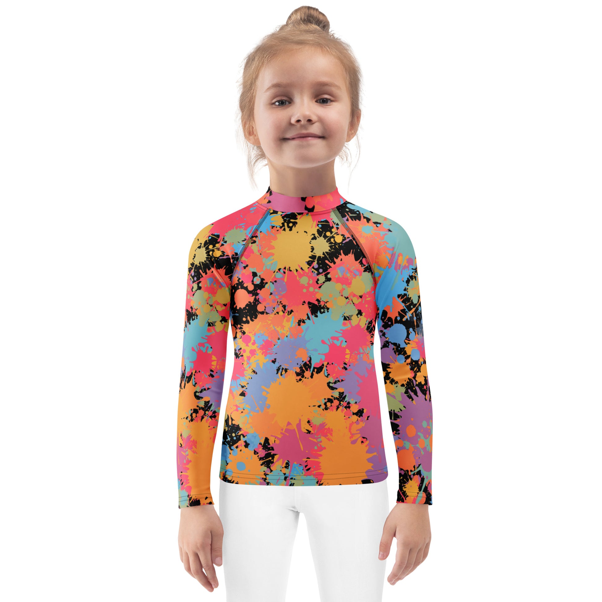 Let your child make a splash with this bold rainbow paint splatter rash guard! Covered in a fun explosion of colors—from hot pink and neon orange to aqua blue and black—this long sleeve swim shirt is made for kids who love to stand out. It's perfect for pool parties, beach adventures, or just staying sun-safe in style.