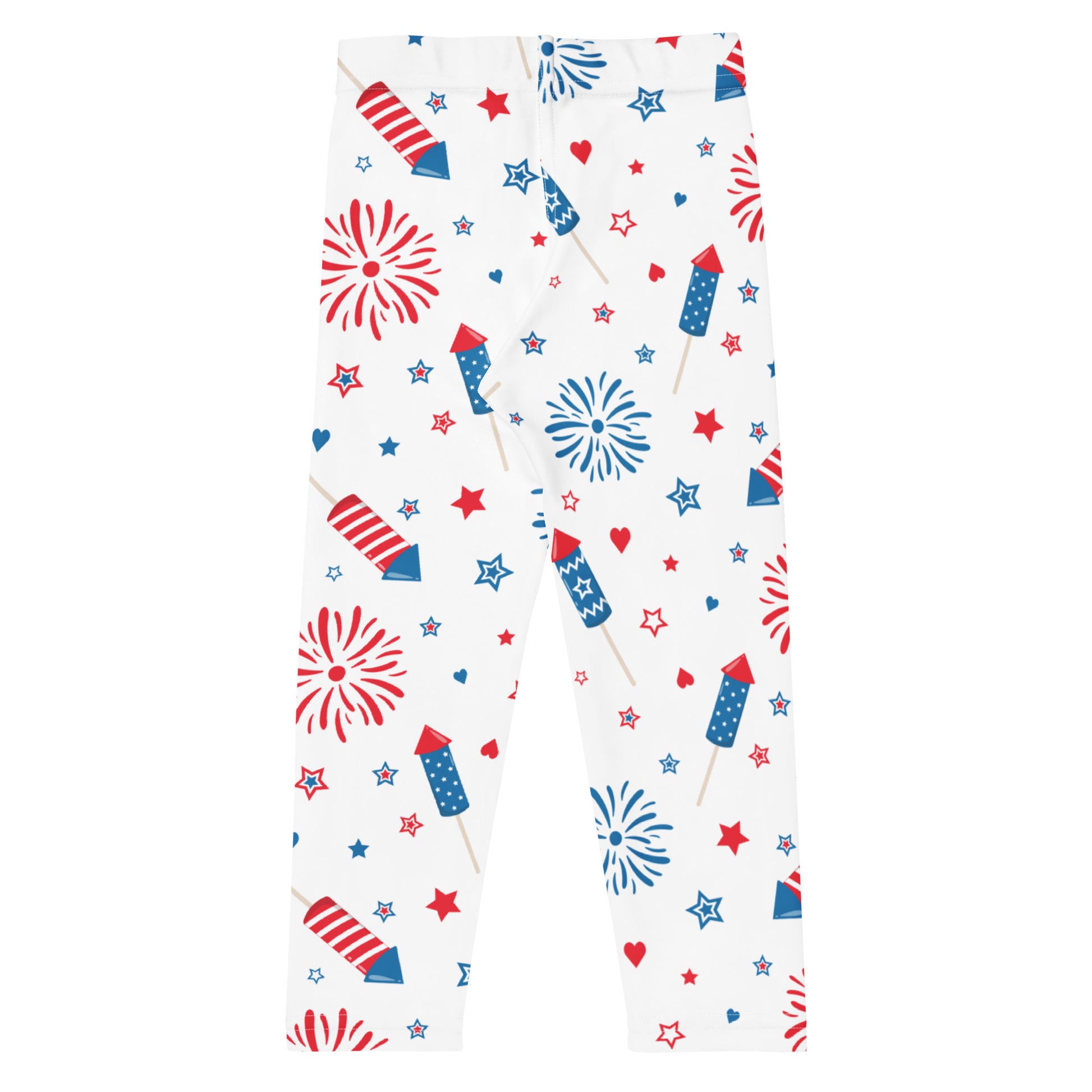 Get your toddler or kid ready to sparkle this Independence Day with these red, white, and blue leggings! Covered in festive fireworks, patriotic rockets, and starry hearts, these soft and stretchy leggings are perfect for 4th of July parades, BBQs, or twirling under the fireworks at night.