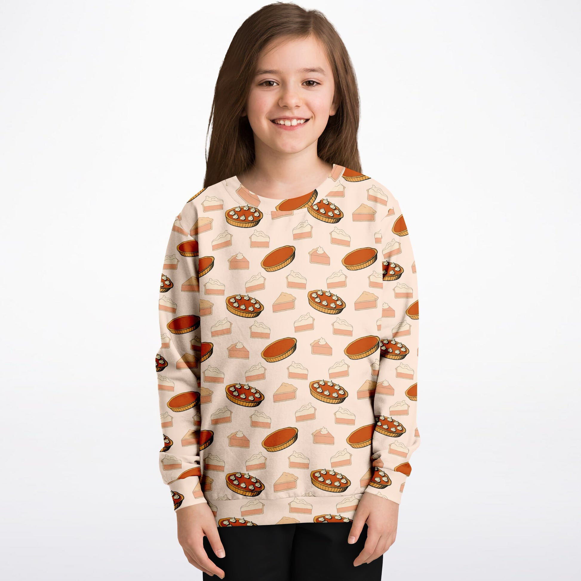 Bring cozy holiday cheer to your child’s wardrobe with this Kids Pumpkin Pie Sweatshirt! Featuring a playful all-over print of pumpkin pie slices and whipped cream-topped desserts, this pullover is perfect for Thanksgiving dinners, family gatherings, and fall fun. Toddlers and kids will love the cheerful design while staying warm and comfortable.