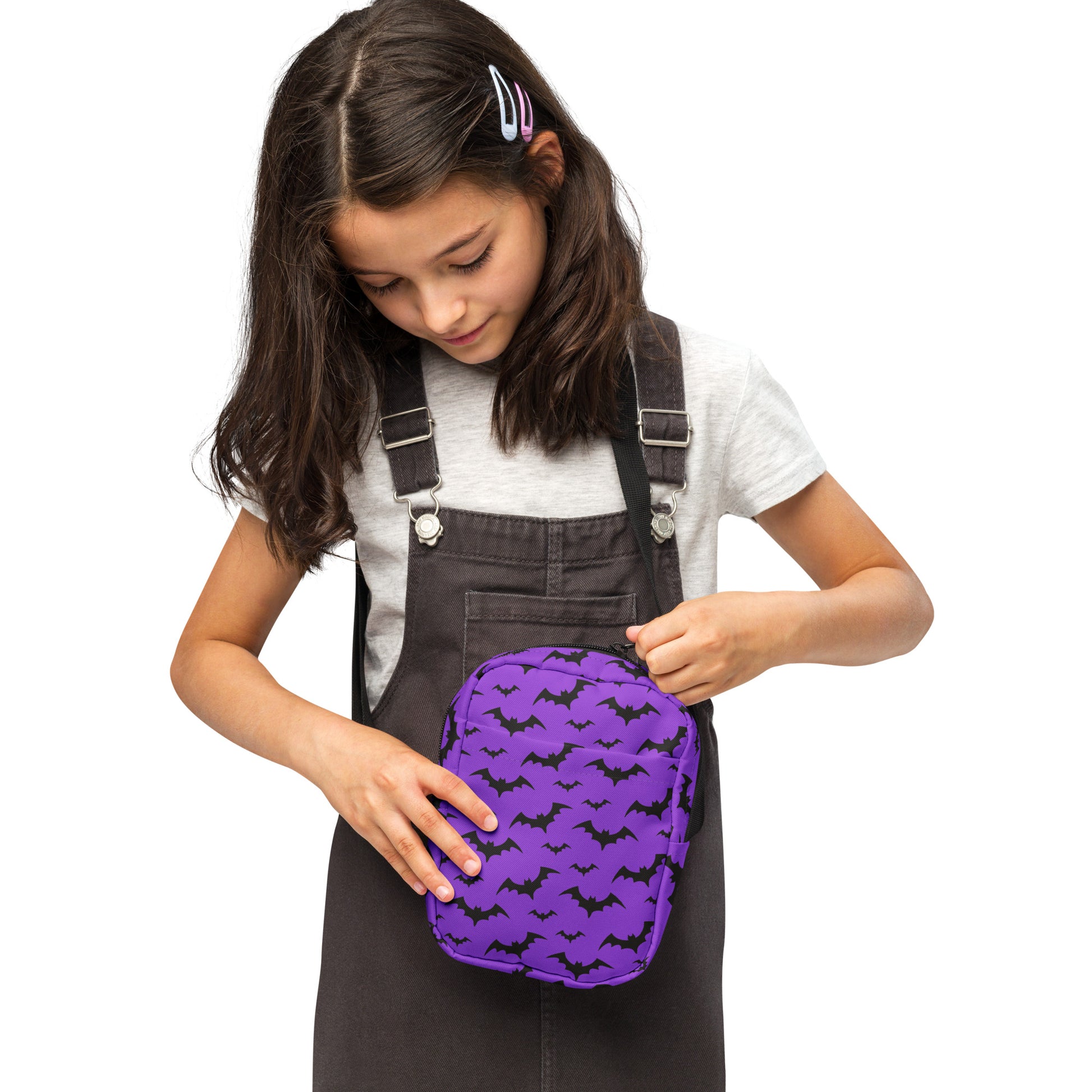 Unleash spooky style with this Kids Halloween Bat Crossbody Bag! Covered in bold black bats on a vivid purple background, this Halloween-ready purse is perfect for little ghouls who love creepy fashion. Whether for trick-or-treating, Halloween parties, or October outings, it’s built to carry candy and essentials in frightfully fun style.