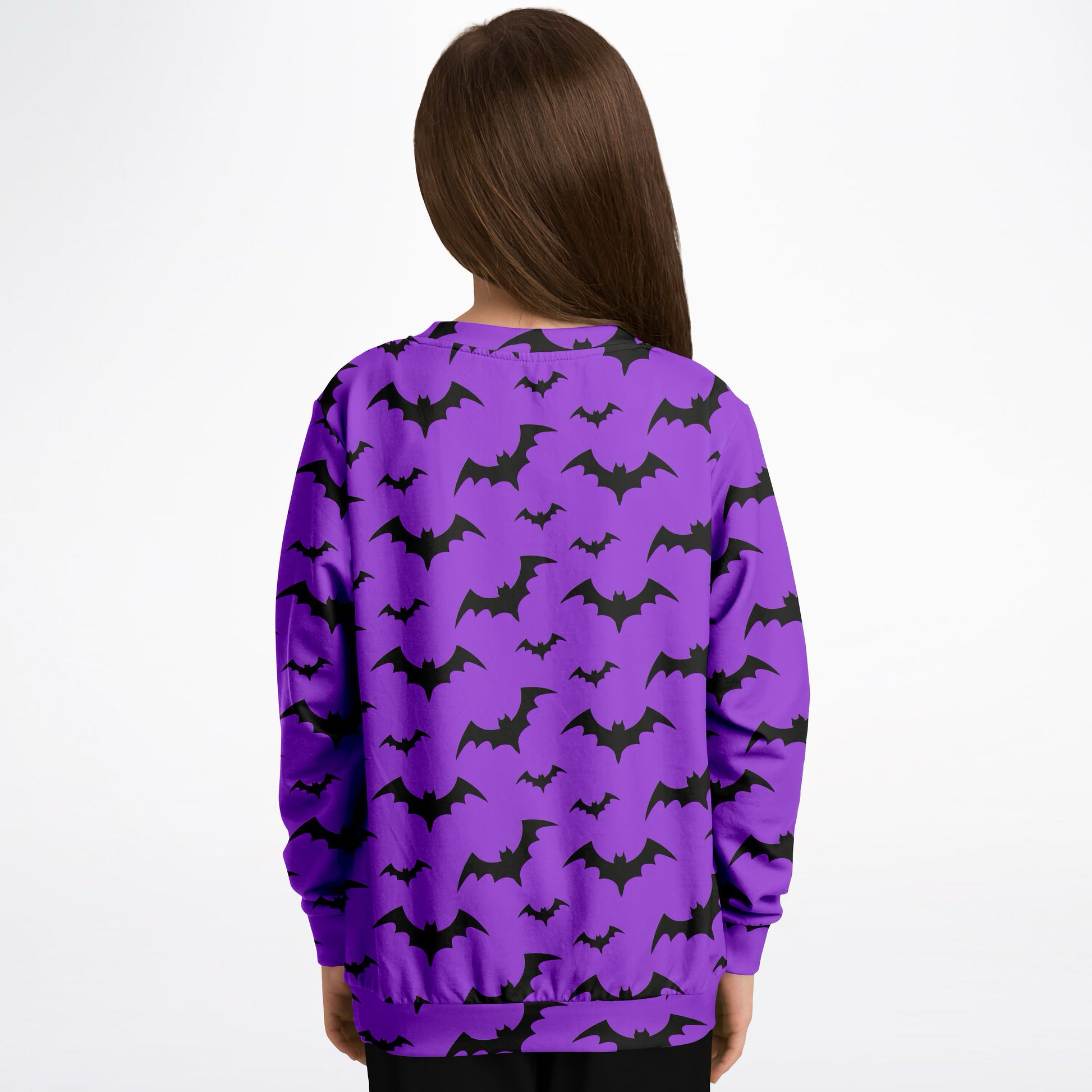 Kids Purple Bats Halloween Sweatshirt – Cozy Cotton Fleece or Lightweight Sports Fabric