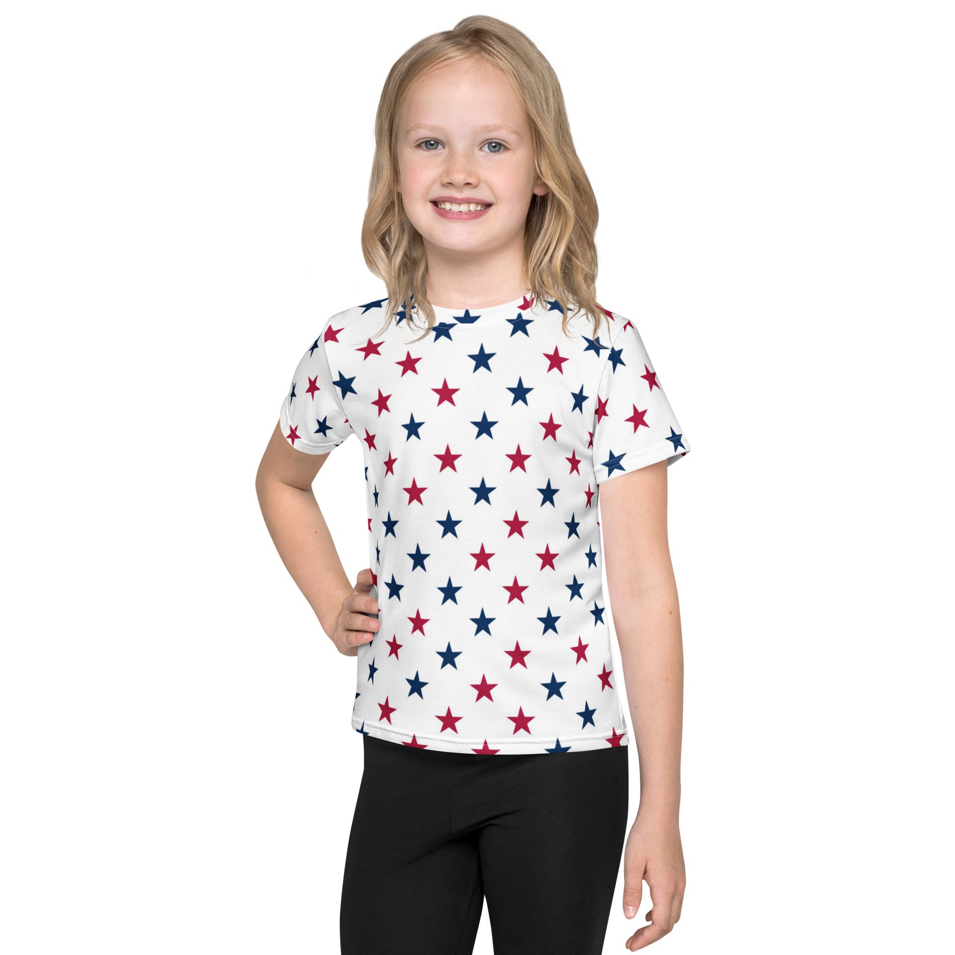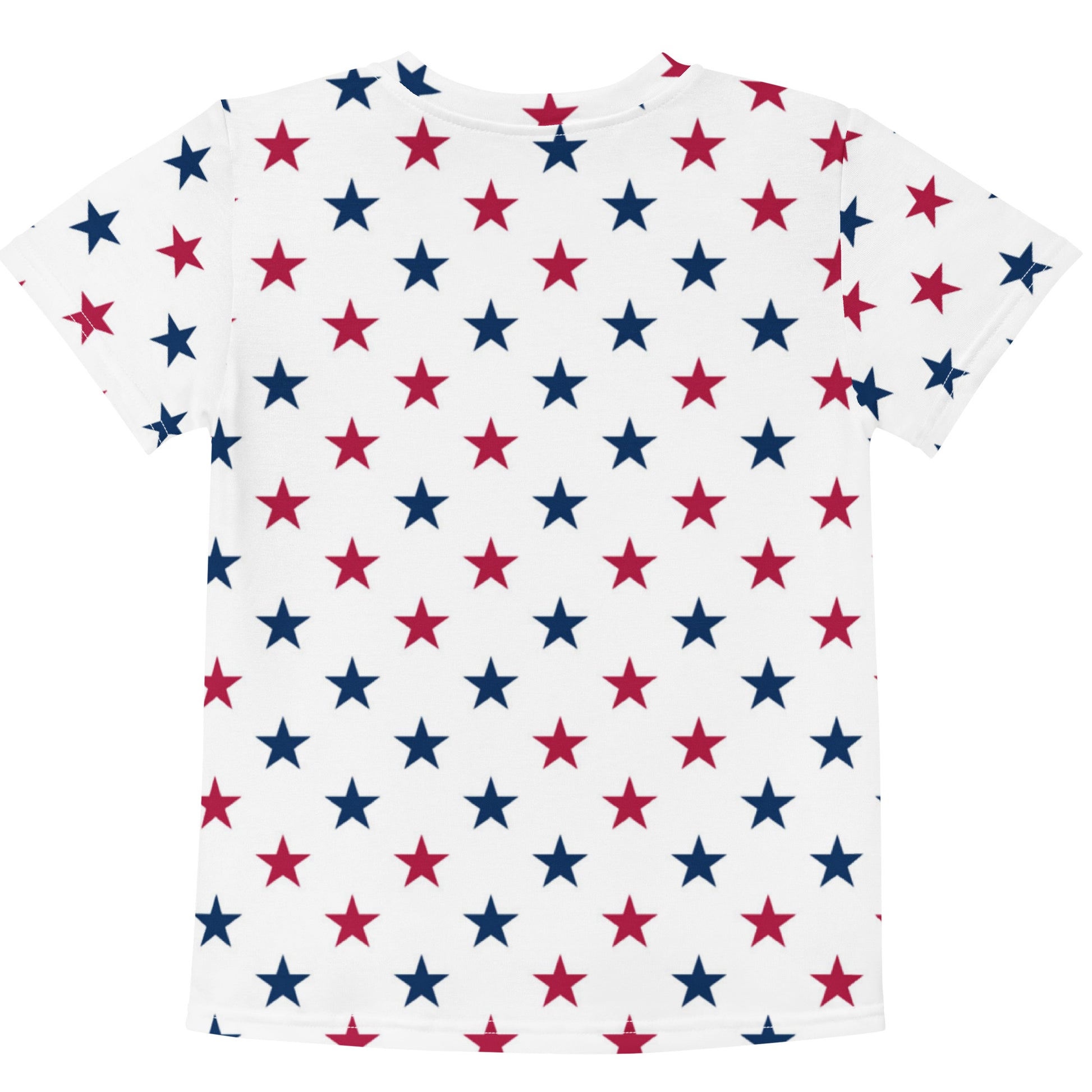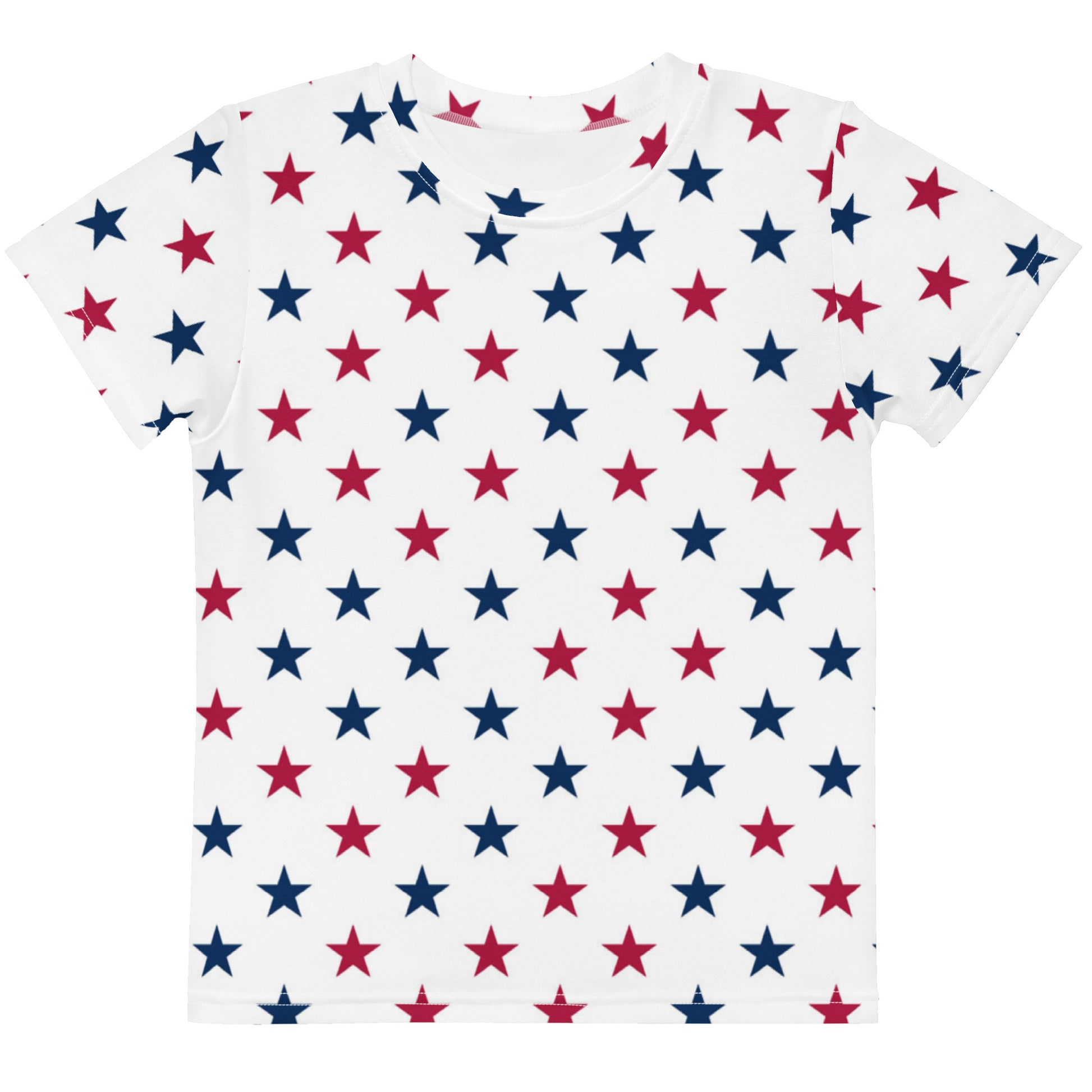 Let your little star shine bright in this Kids Red & Blue Stars USA T-Shirt! Featuring an all-over pattern of bold red and navy stars on a crisp white background, this tee brings a classic Americana vibe to any outfit—perfect for 4th of July, summer picnics, or everyday adventures.