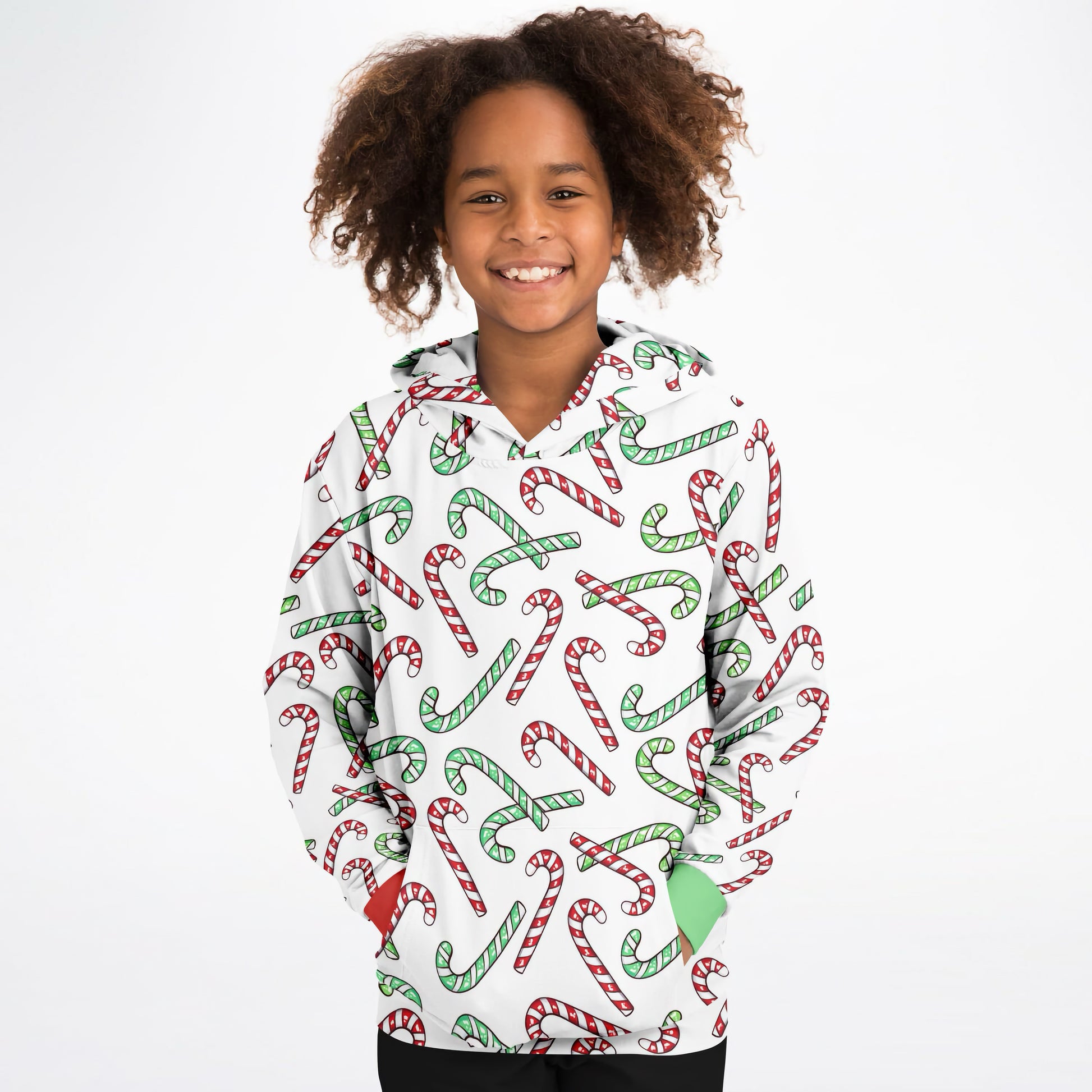 Kids Red & Green Candy Cane Christmas Hoodie – Cozy Cotton Fleece or Lightweight Sports Fabric