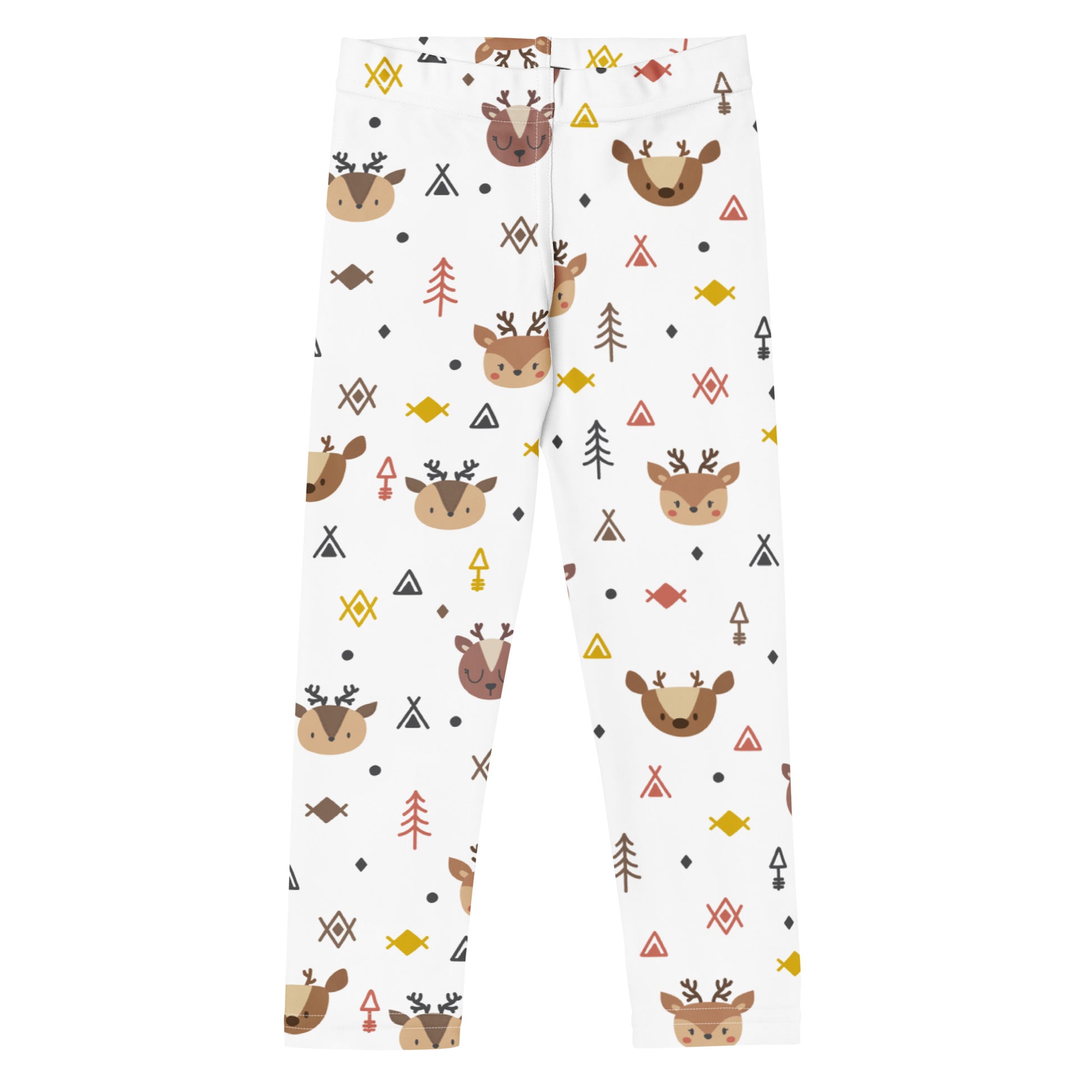 Bring a touch of woodland magic to their wardrobe with these kids’ reindeer leggings. Featuring sweet reindeer faces, trees, and playful geometric accents on a clean white background, they’re perfect for winter outfits, cozy school days, or outdoor adventures. Made with buttery-soft stretch fabric, these toddler and kids leggings deliver all-day comfort, while UPF 50+ protection and durable stitching make them practical enough for everyday wear.