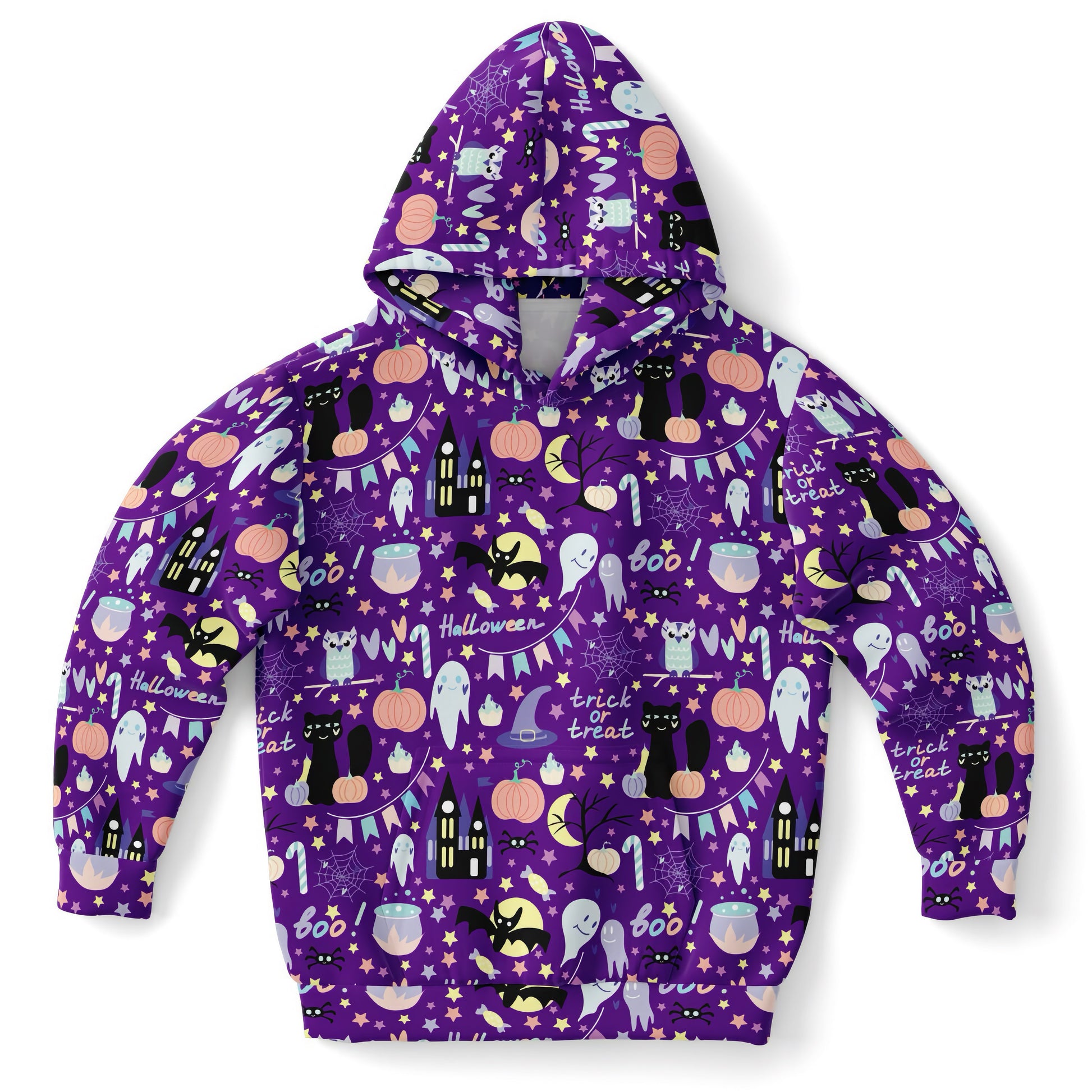Celebrate spooky season in style with the Kids Spooky Halloween Hoodie. Bursting with playful details—smiling ghosts, black cats, pumpkins, candy, stars, and haunted castles—this purple sweatshirt is perfect for toddlers, kids, and teens who love Halloween fun. Whether she’s trick-or-treating, heading to a fall party, or simply keeping cozy on cooler days, this hoodie combines festive style with lasting comfort.