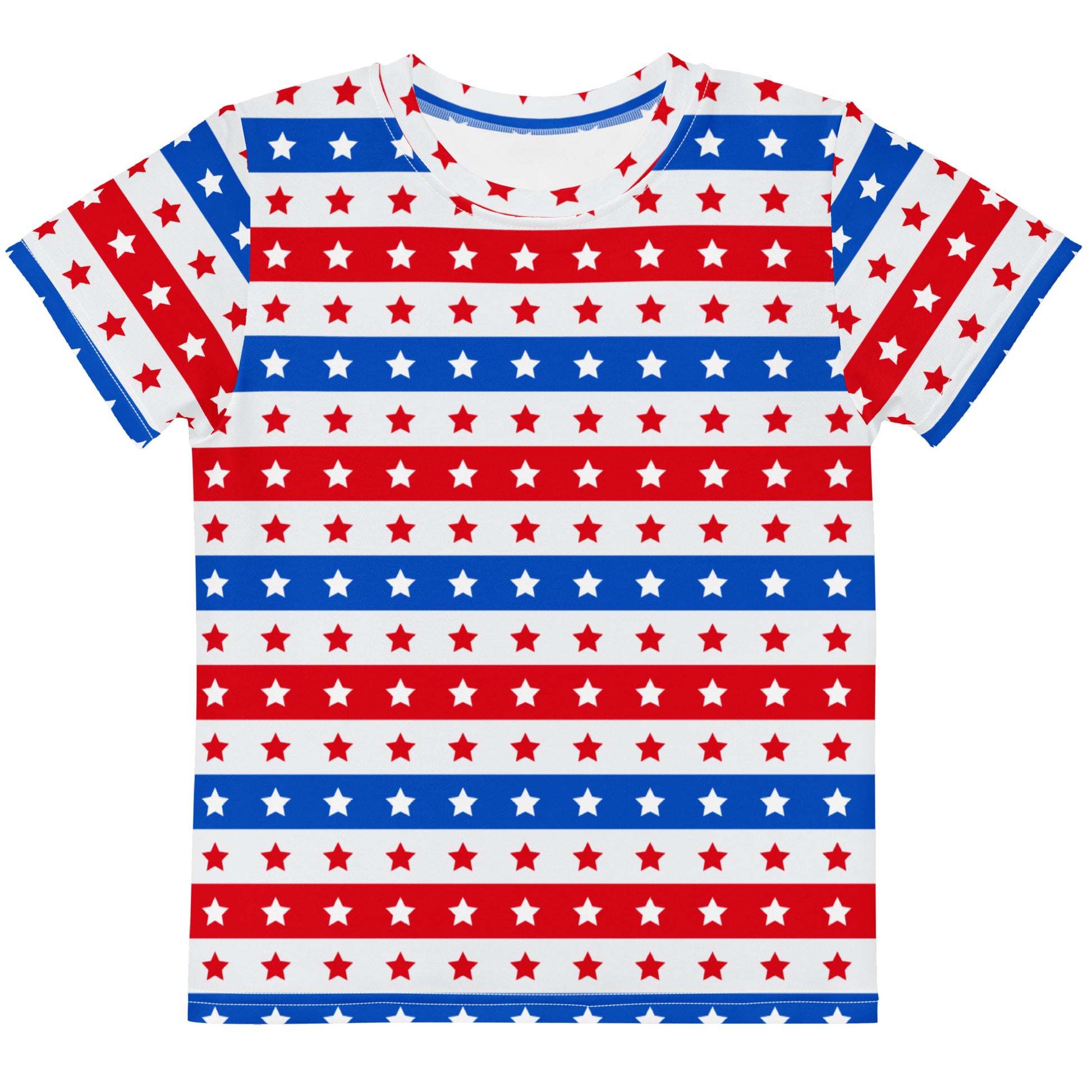 Festive All-Over Print: Rows of red and blue stripes filled with white and red stars give this shirt a bold, fun look that’s perfect for holidays or everyday wear.