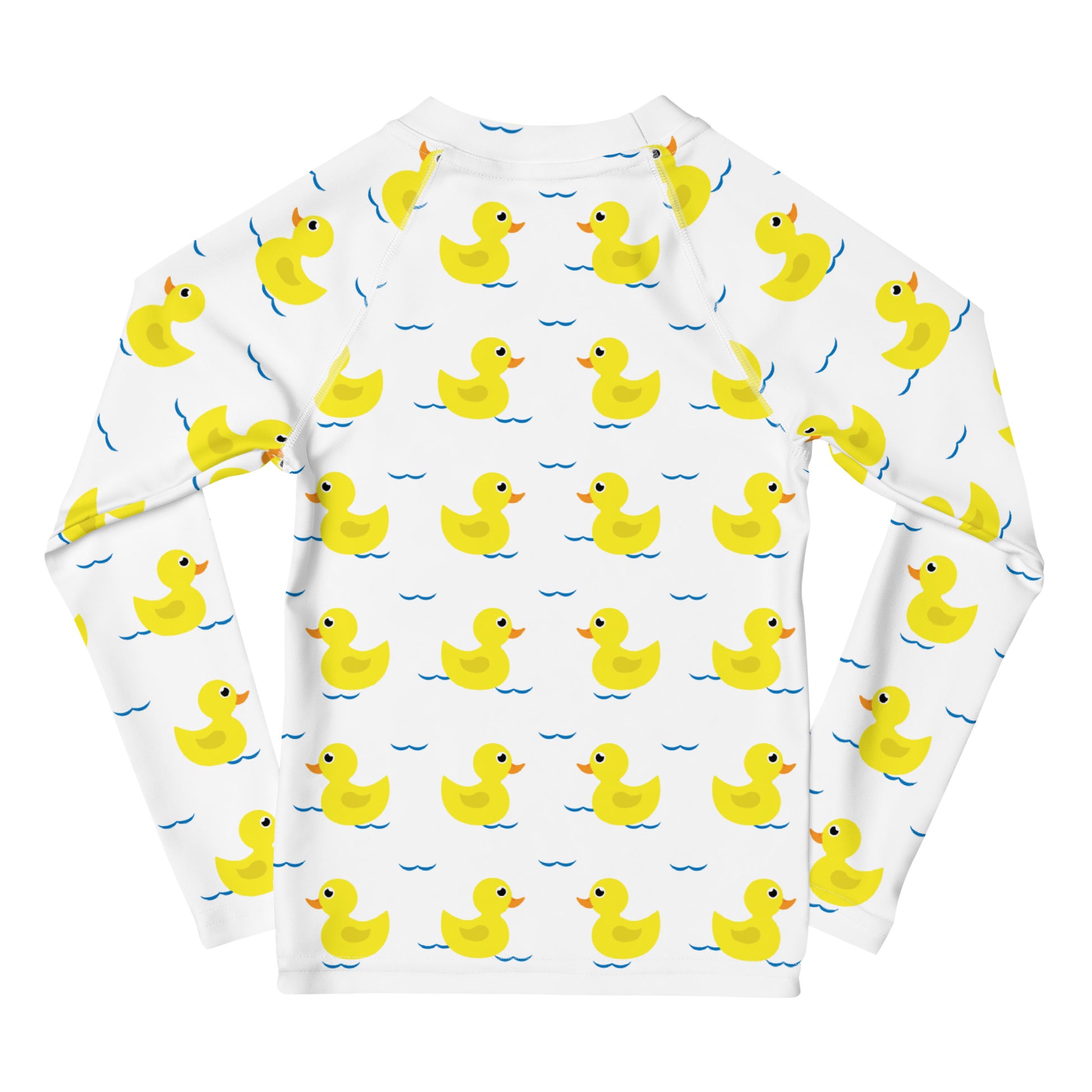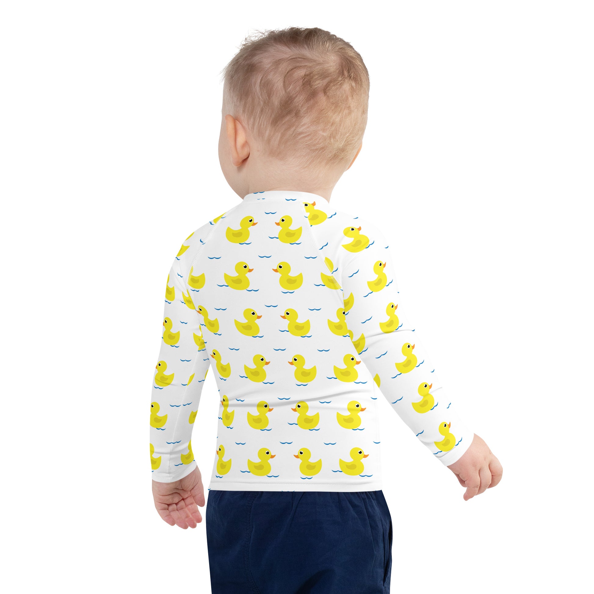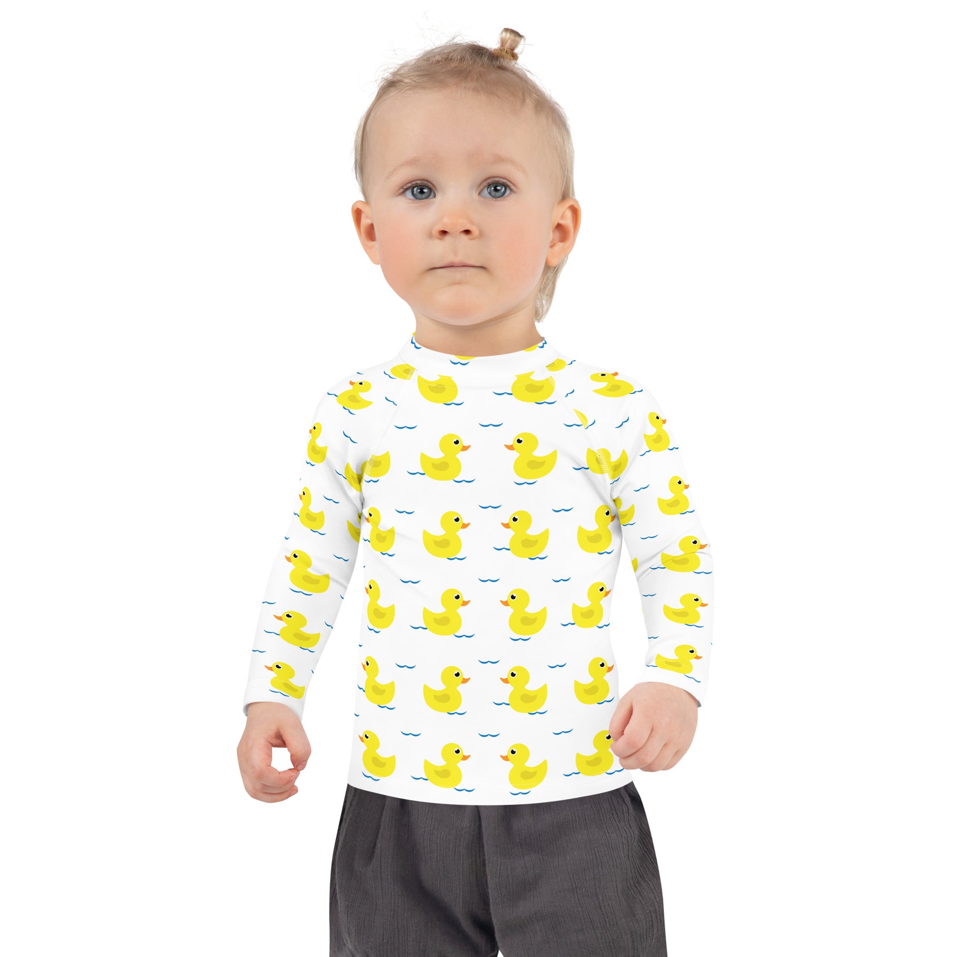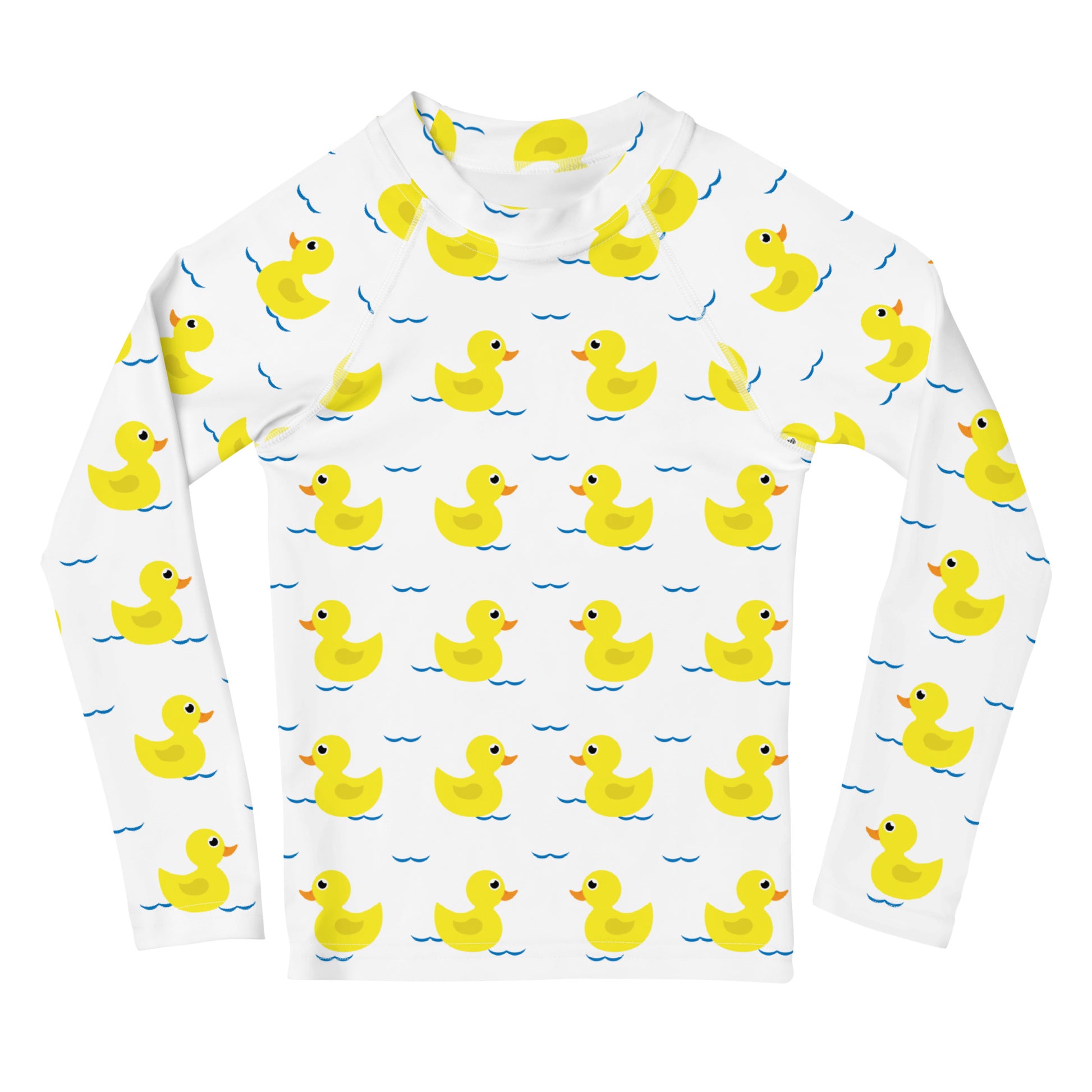 Splish, splash, and quack into summer fun with this kids' yellow duck long sleeve rash guard swim shirt! Adorned with cheerful yellow ducklings paddling across a white background, this adorable swim top is made for toddlers and little ones who love bath time vibes and poolside play. It’s the perfect pick for sunny days spent near the water.