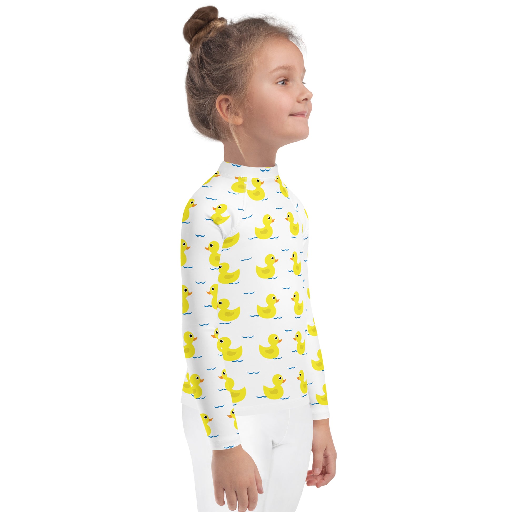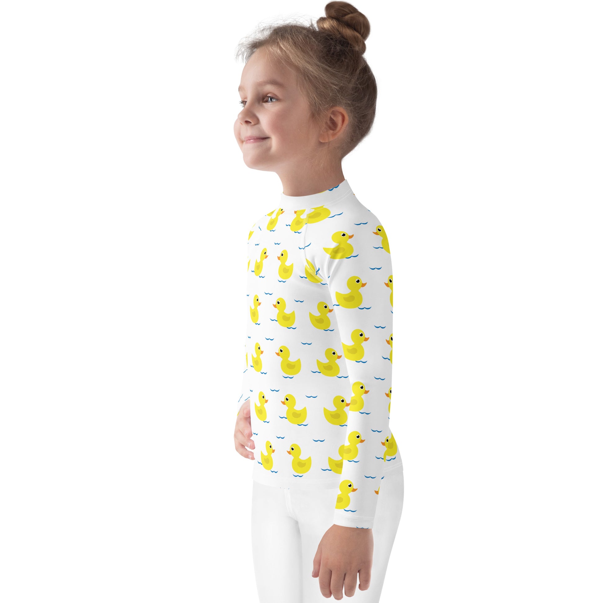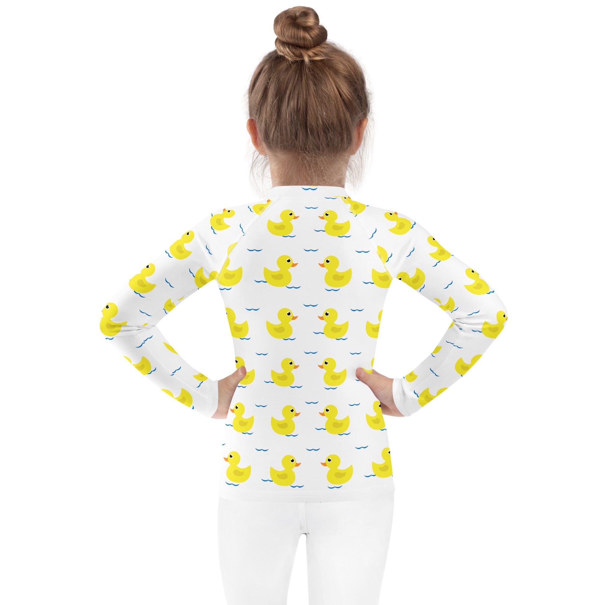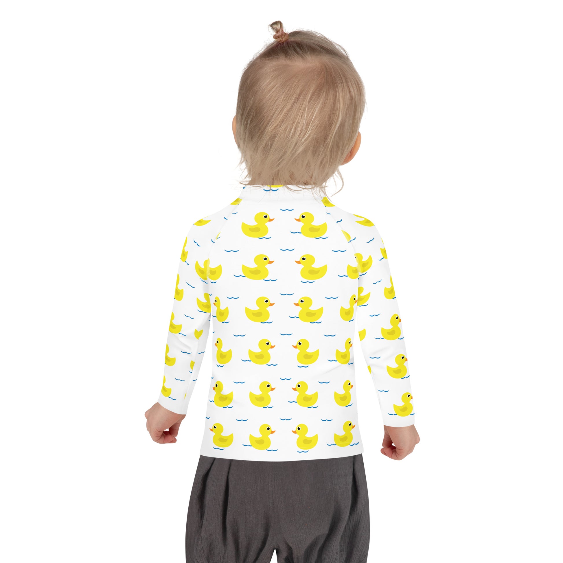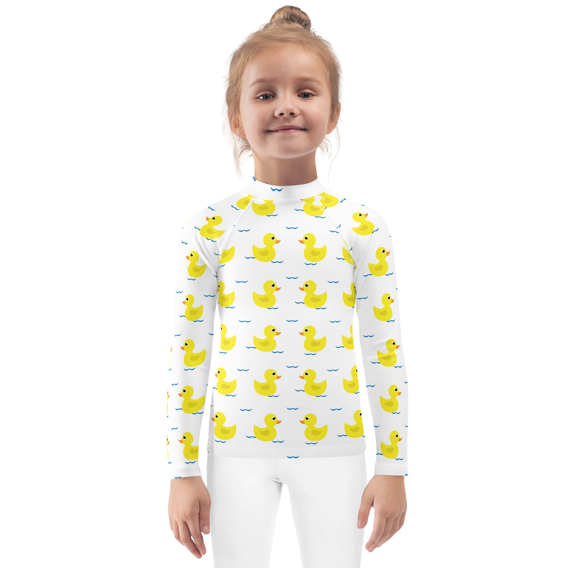 Splish, splash, and quack into summer fun with this kids' yellow duck long sleeve rash guard swim shirt! Adorned with cheerful yellow ducklings paddling across a white background, this adorable swim top is made for toddlers and little ones who love bath time vibes and poolside play. It’s the perfect pick for sunny days spent near the water.