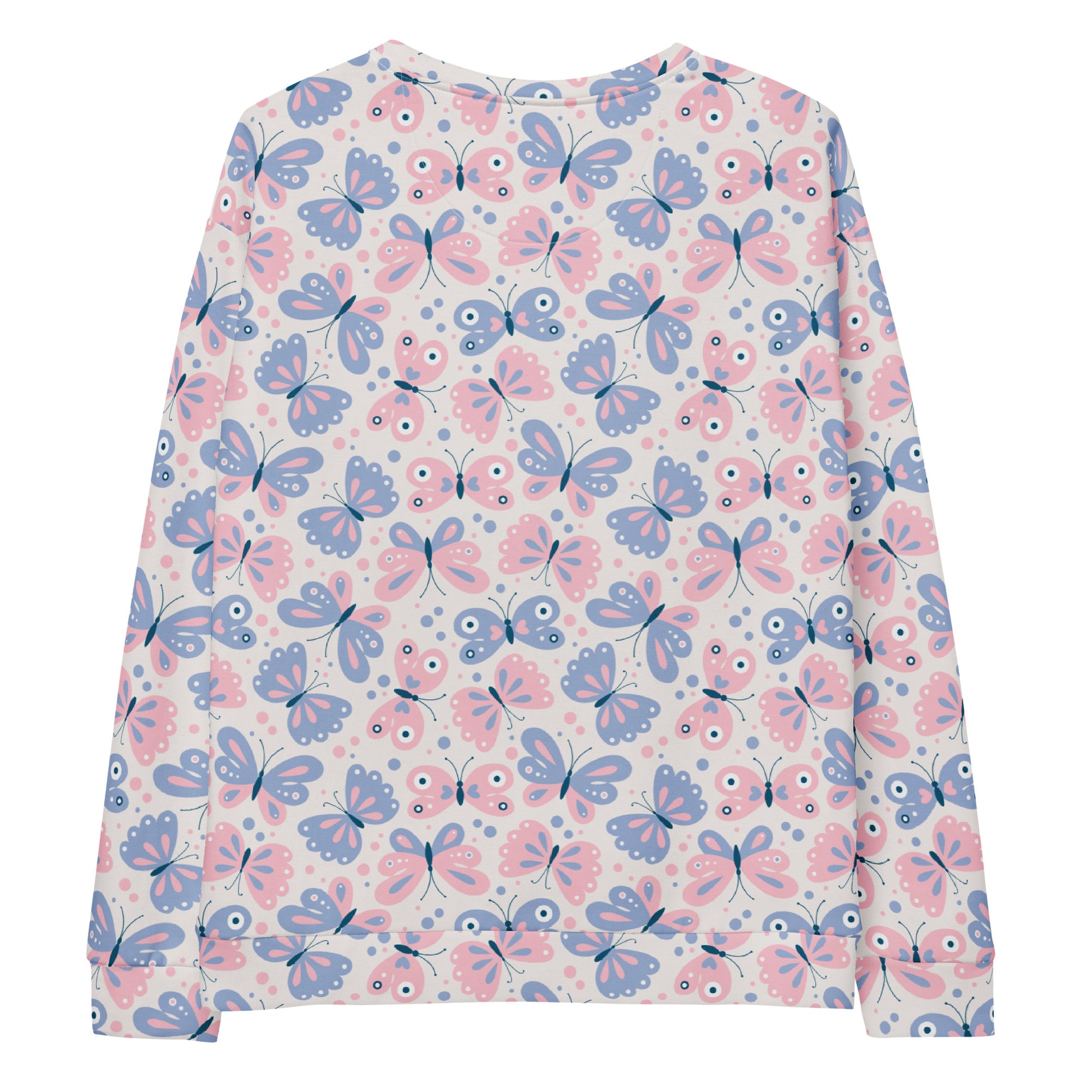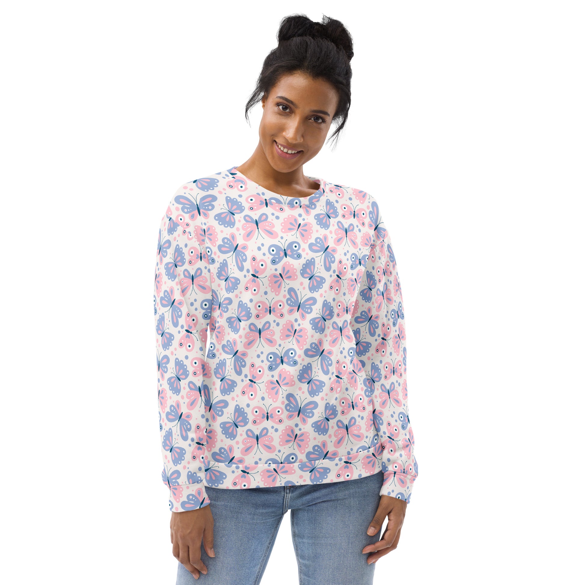 Add a touch of whimsy to your wardrobe with our Pastel Butterfly Sweatshirt, featuring a sweet all-over print of pink and blue butterflies on a soft white background. Crafted from eco-friendly recycled polyester and brushed fleece, this unisex pullover is both cozy and lightweight, making it perfect for layering through spring, summer evenings, and beyond. A charming choice for butterfly lovers and anyone who enjoys cheerful, pastel fashion.