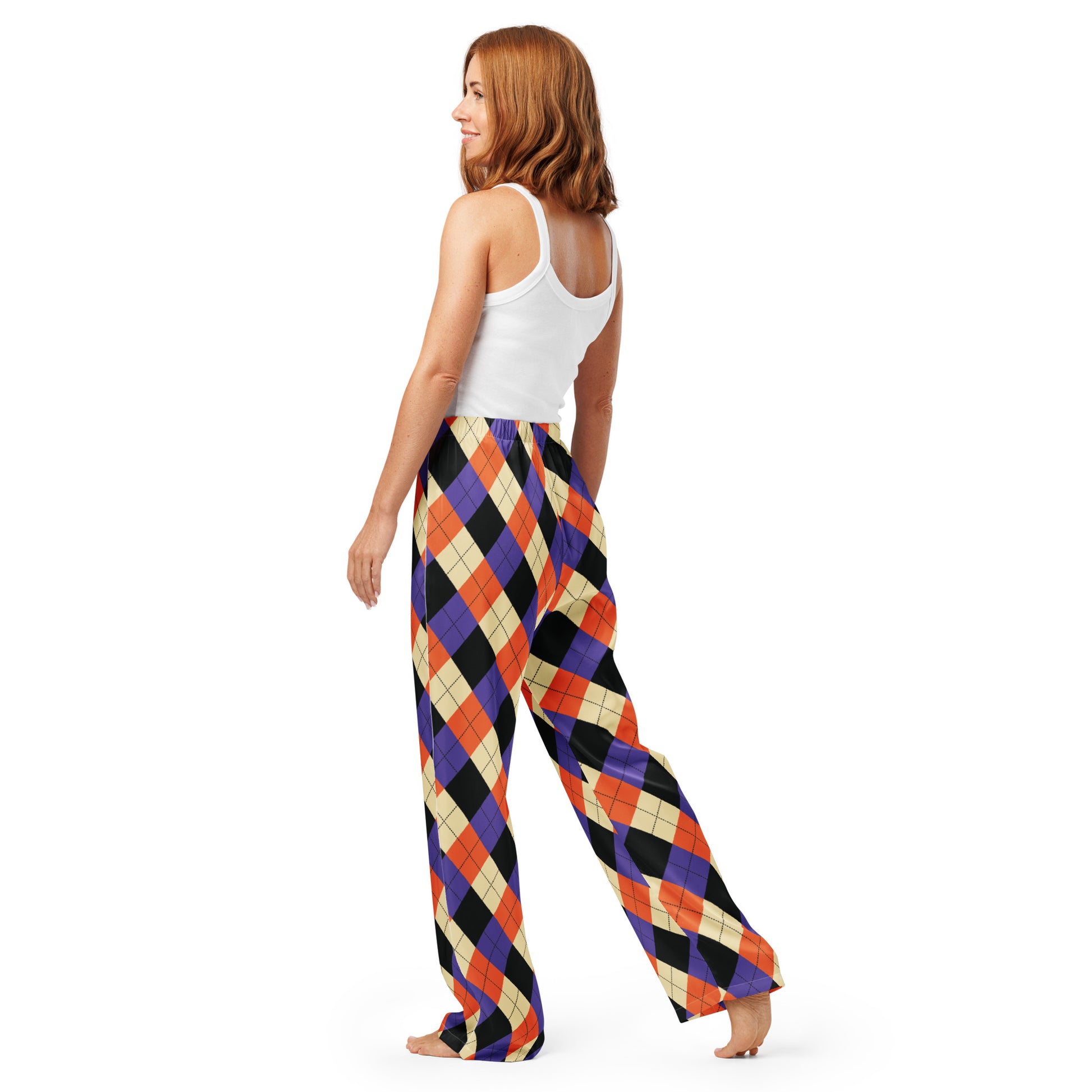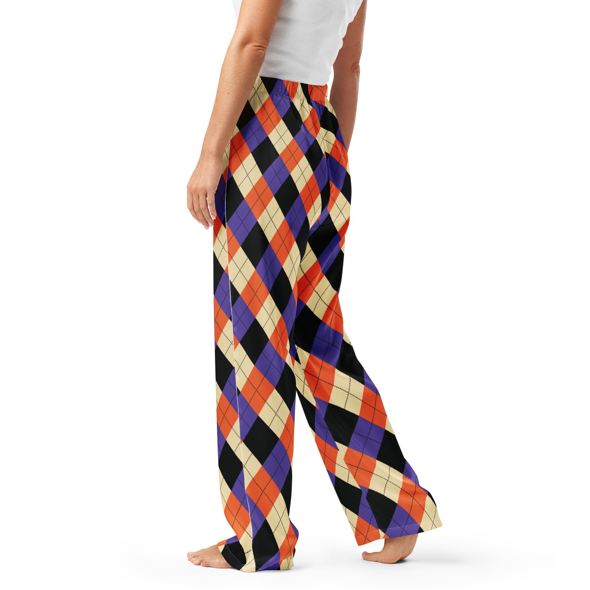 Add a spooky twist to your loungewear with these women’s Halloween argyle pajama pants. Featuring a bold diamond plaid in festive orange, purple, black, and cream, they’re the perfect mix of cozy and seasonal style. Whether you’re handing out candy, watching scary movies, or just relaxing on a crisp October night, these pants keep you comfy and in the Halloween spirit. Made from lightweight polyester with a silky feel, they feature a relaxed fit, drawstring waistband, and decorative piping for a polished touch.