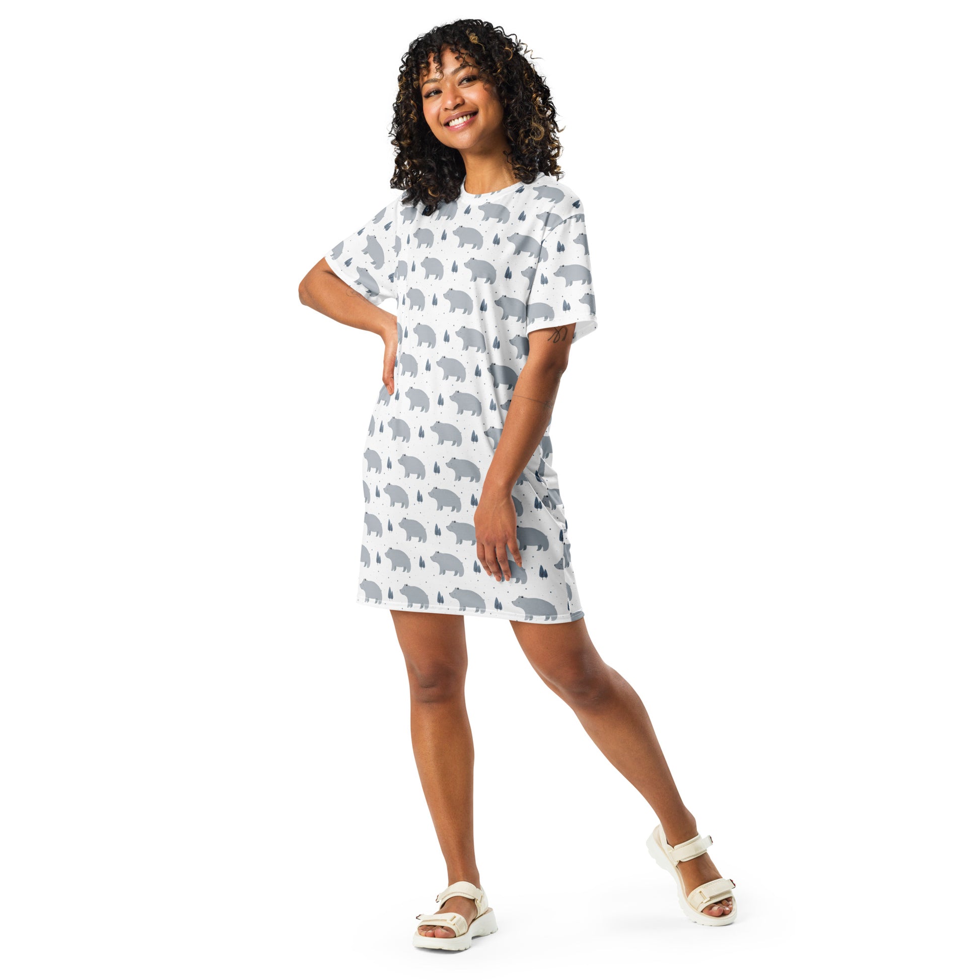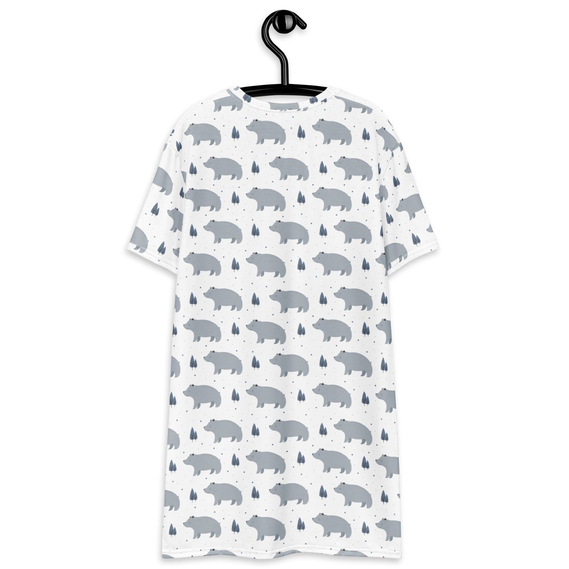 Bring cozy forest vibes into your everyday style with this women’s bear print t-shirt dress. Featuring a charming all-over design of soft gray bears, tiny trees, and scattered snowflakes, this oversized tee dress blends comfort with playful winter charm.