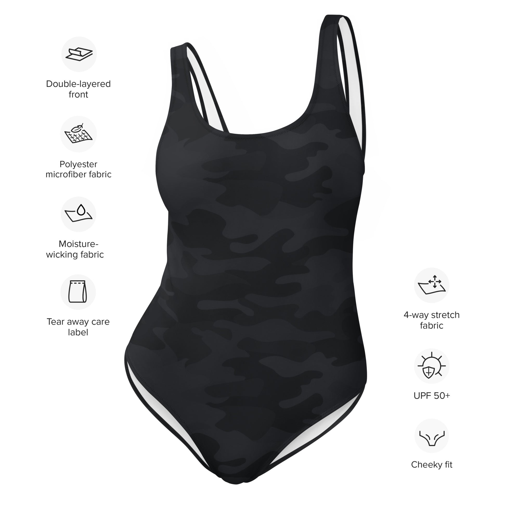 Keep your cool and blend into beach vibes with our Women's Black Camo One-Piece Swimsuit. This sleek, tone-on-tone camouflage print brings a bold twist to classic swimwear.