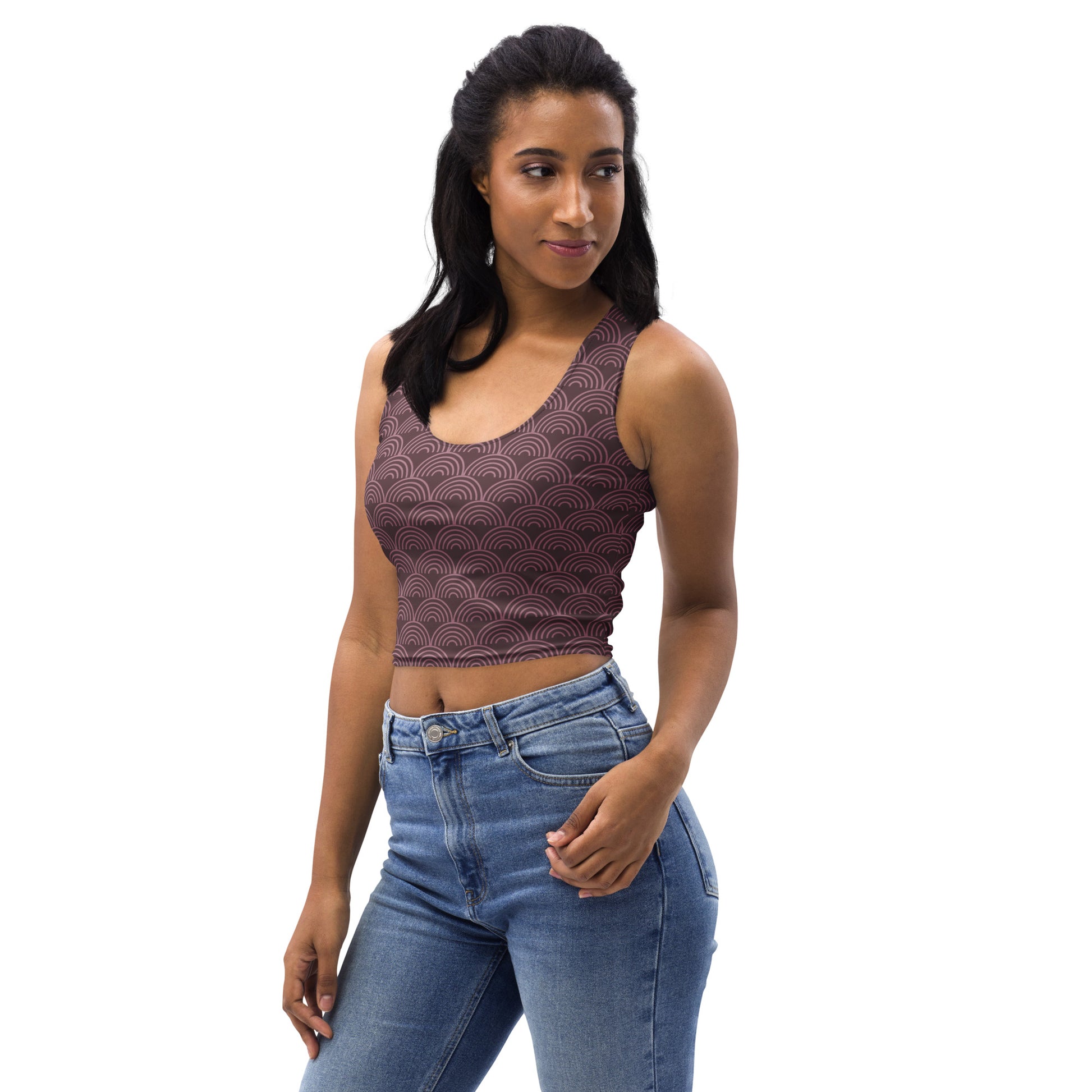 Add a touch of charm to your everyday look with this Burgundy Rainbow Crop Top. Designed with repeating half-rainbow arcs in soft pink over a rich burgundy base, this minimalist geometric print blends vintage vibes with a modern aesthetic