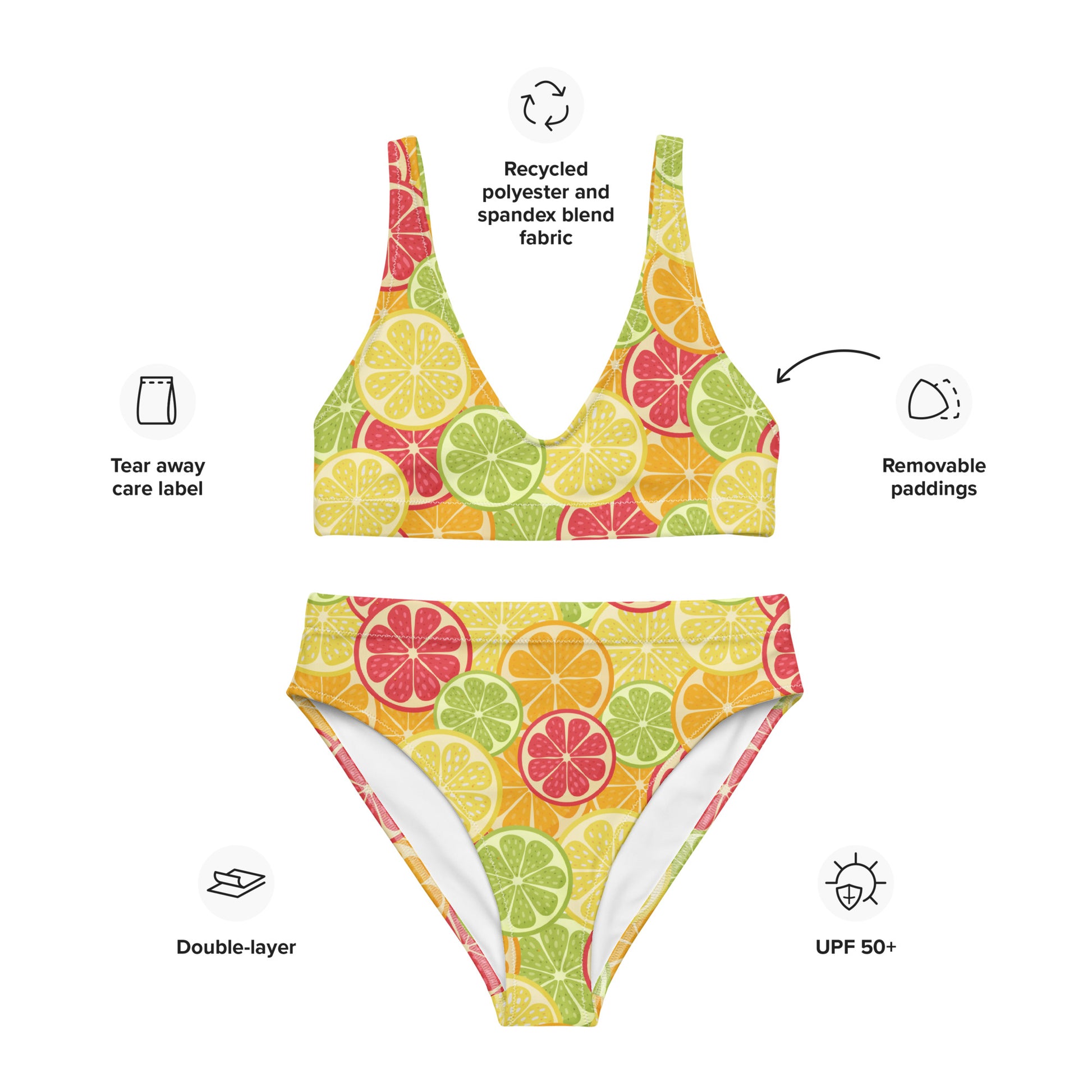Bring zesty energy to your swimwear with this citrus-inspired bikini, covered in juicy slices of lemon, lime, orange, and grapefruit. Bursting with color and personality, this bikini is made from eco-friendly fabric that dries quickly and shields your skin with UPF 50+ protection. The scoop-neck top includes removable pads, and the high-waisted bikini bottom offers a flattering, stay-in-place fit for all-day comfort.