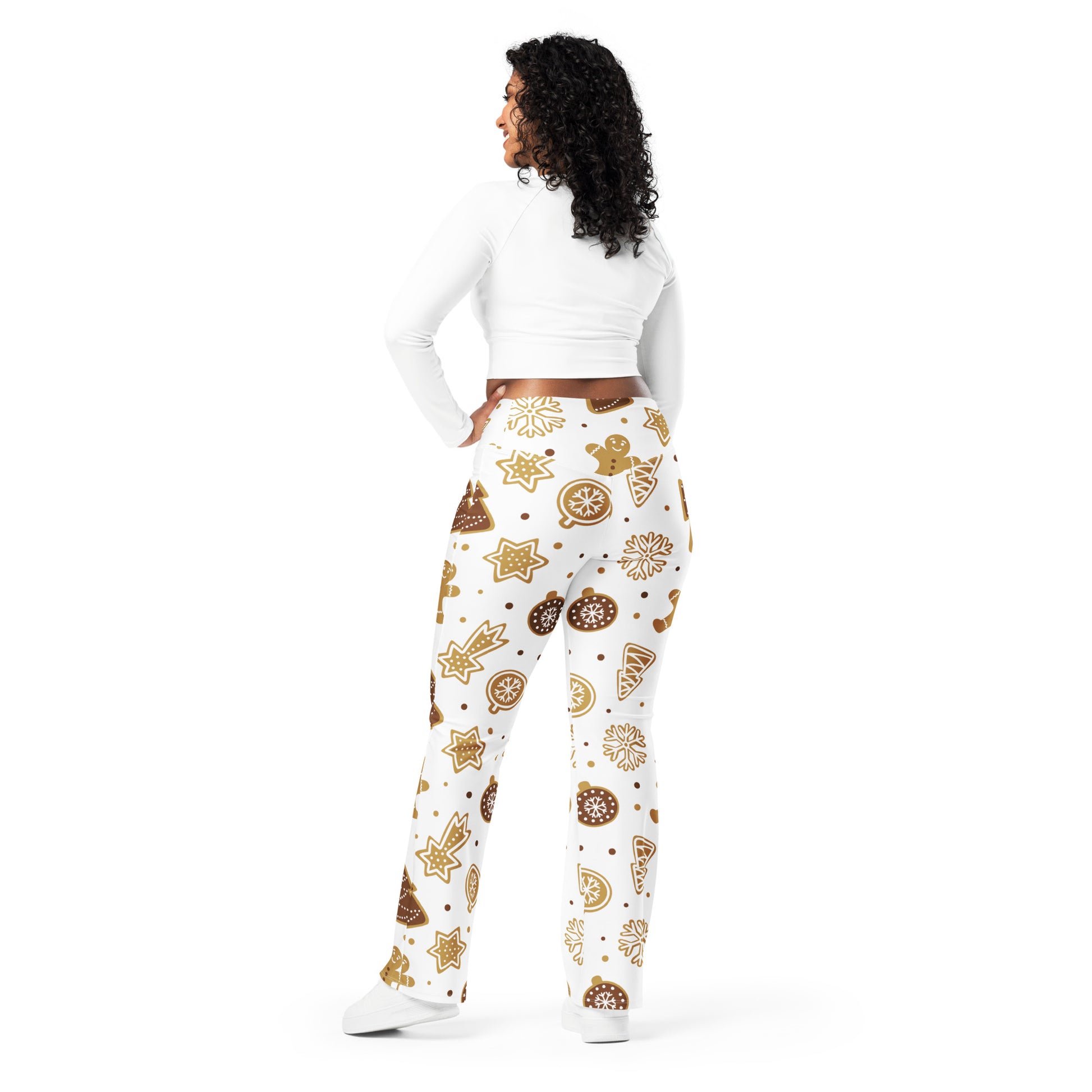 Bake some holiday cheer into your wardrobe with these women’s gingerbread cookie flare leggings. Featuring a playful all-over print of gingerbread men, snowflakes, and cookie shapes on a crisp white background, they’re the perfect mix of cozy and festive. The high-waisted fit smooths and supports, while the flared bottoms add a trendy retro vibe. Wear them to holiday parties, cookie swaps, or just for lounging with cocoa by the tree.
