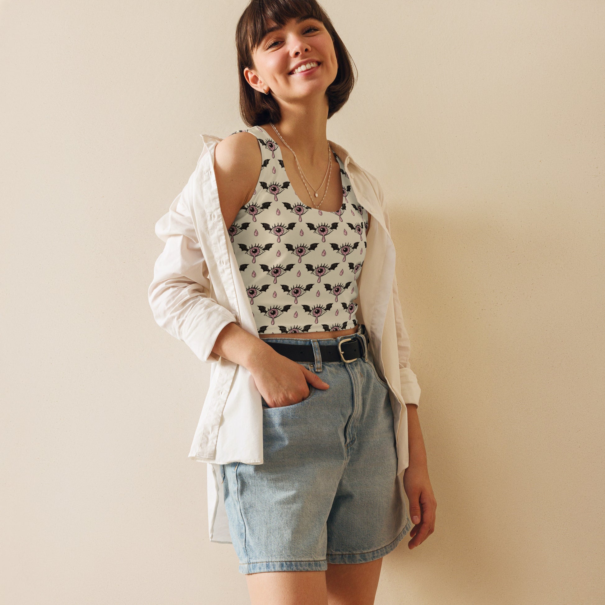 Stand out with a look that’s equal parts edgy and mystical in this Women’s Gothic Eye Crop Top. Featuring an all-over print of bold, dark all-seeing eyes with ornate lashes and teardrop accents, it’s the perfect piece for Halloween nights, festivals, or making a statement in your everyday style.