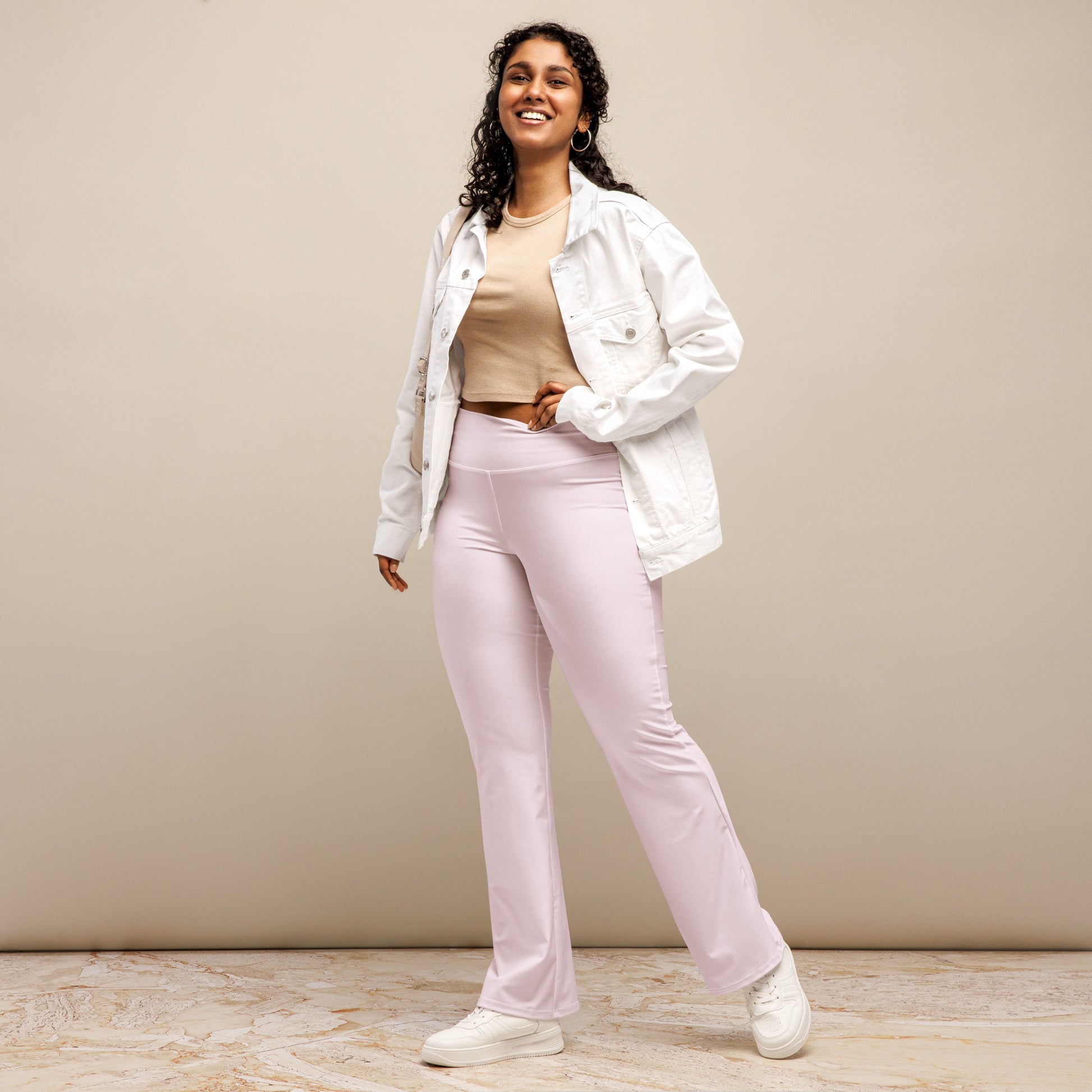 Clean, sleek, and endlessly versatile—these light pink flare leggings are a wardrobe staple. With a flattering high waist and a subtle retro flare cut, they’re perfect for yoga, lounging, or creating effortlessly chic everyday outfits. Pair them with crop tops, oversized sweaters, or fitted blouses for a timeless look that goes with anything.