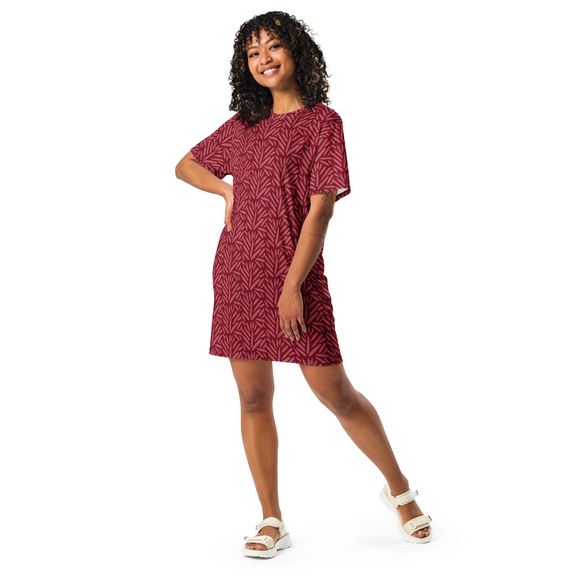 Women's Maroon Leaf Pattern T-Shirt Dress