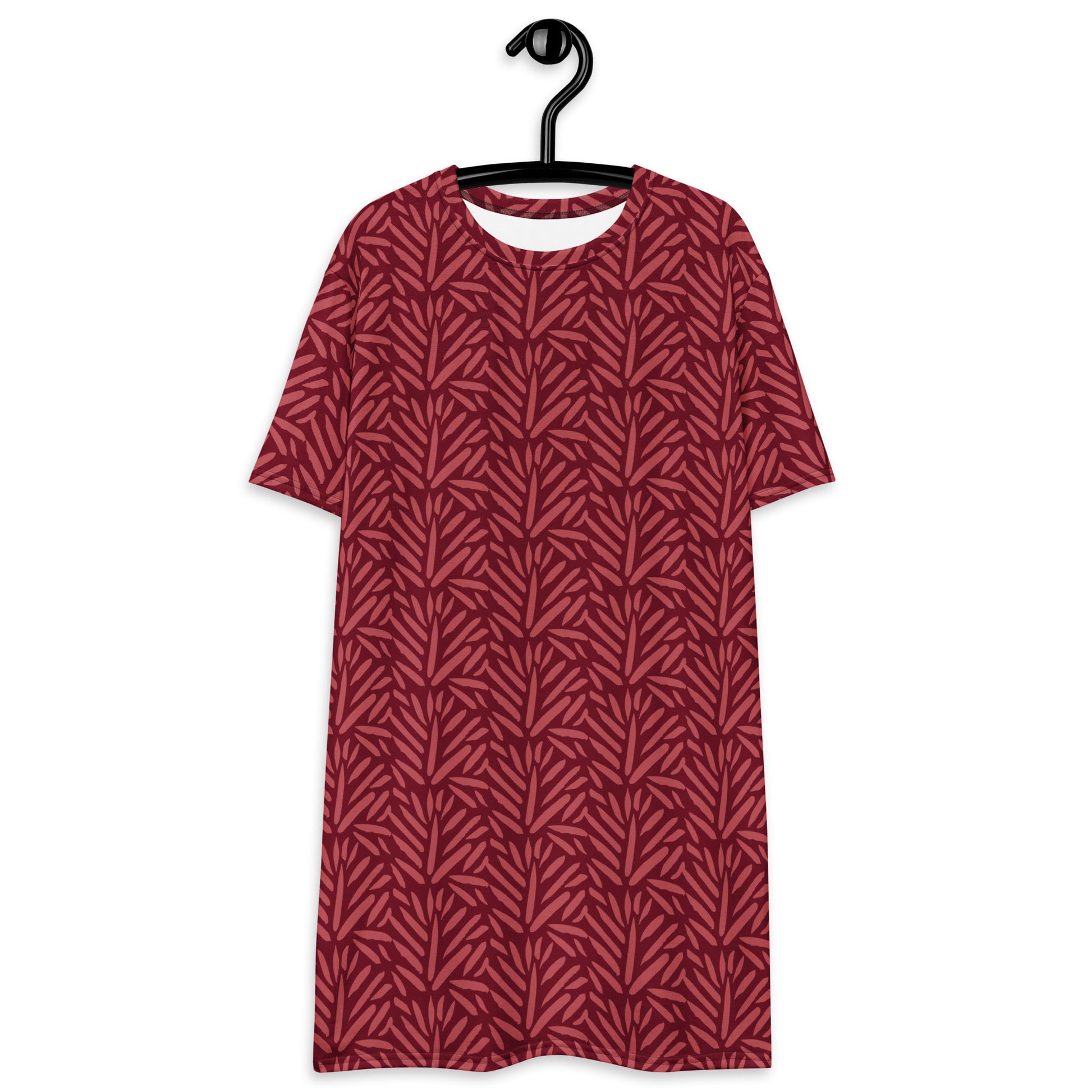Elevate your laid-back look with this women's maroon t-shirt dress, styled with a modern leaf pattern and a cozy oversized silhouette. The deep red tone adds a rich, earthy vibe, while the drop-shoulder design and stretchy fabric offer effortless comfort from morning to night.