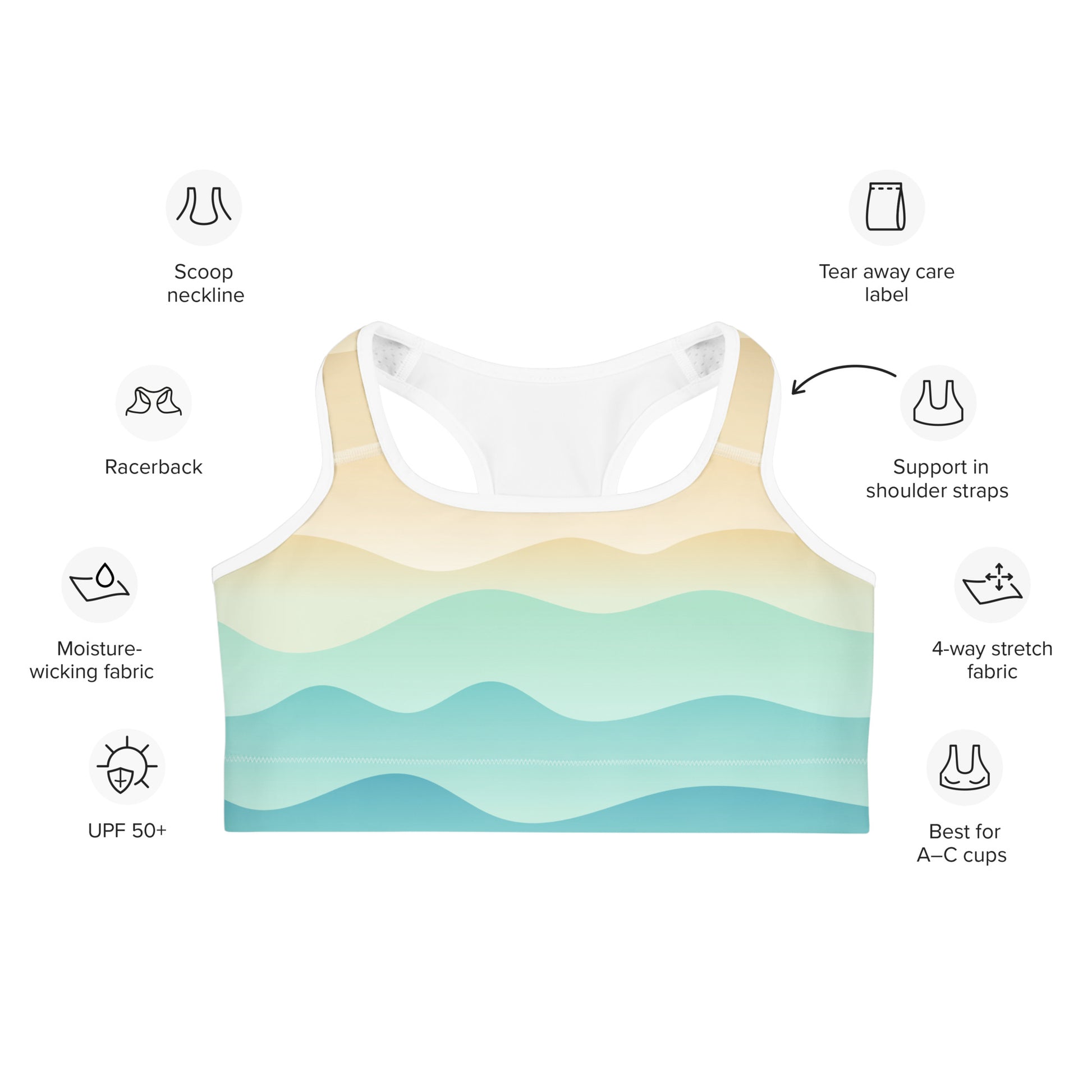 Flow with the tide in this serene ocean wave sports bra, featuring a soft gradient of sandy beige to seafoam blue. Designed to channel beachy calm and breezy energy, it's perfect for yoga by the sea, sunrise jogs, or simply bringing tranquil vibes into your day.