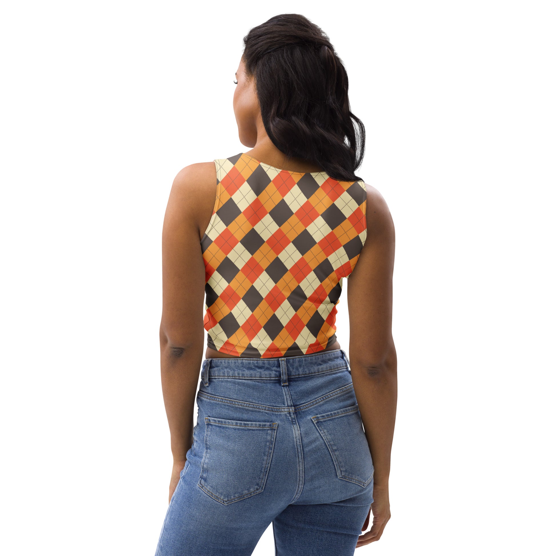 Bring cozy fall vibes into your wardrobe with the Women’s Orange Plaid Argyle Crop Top. Featuring a bold orange, gold, and brown argyle pattern, this top is perfect for pumpkin patch trips, Halloween parties, cozy coffee runs, and layering into your favorite autumn outfits.