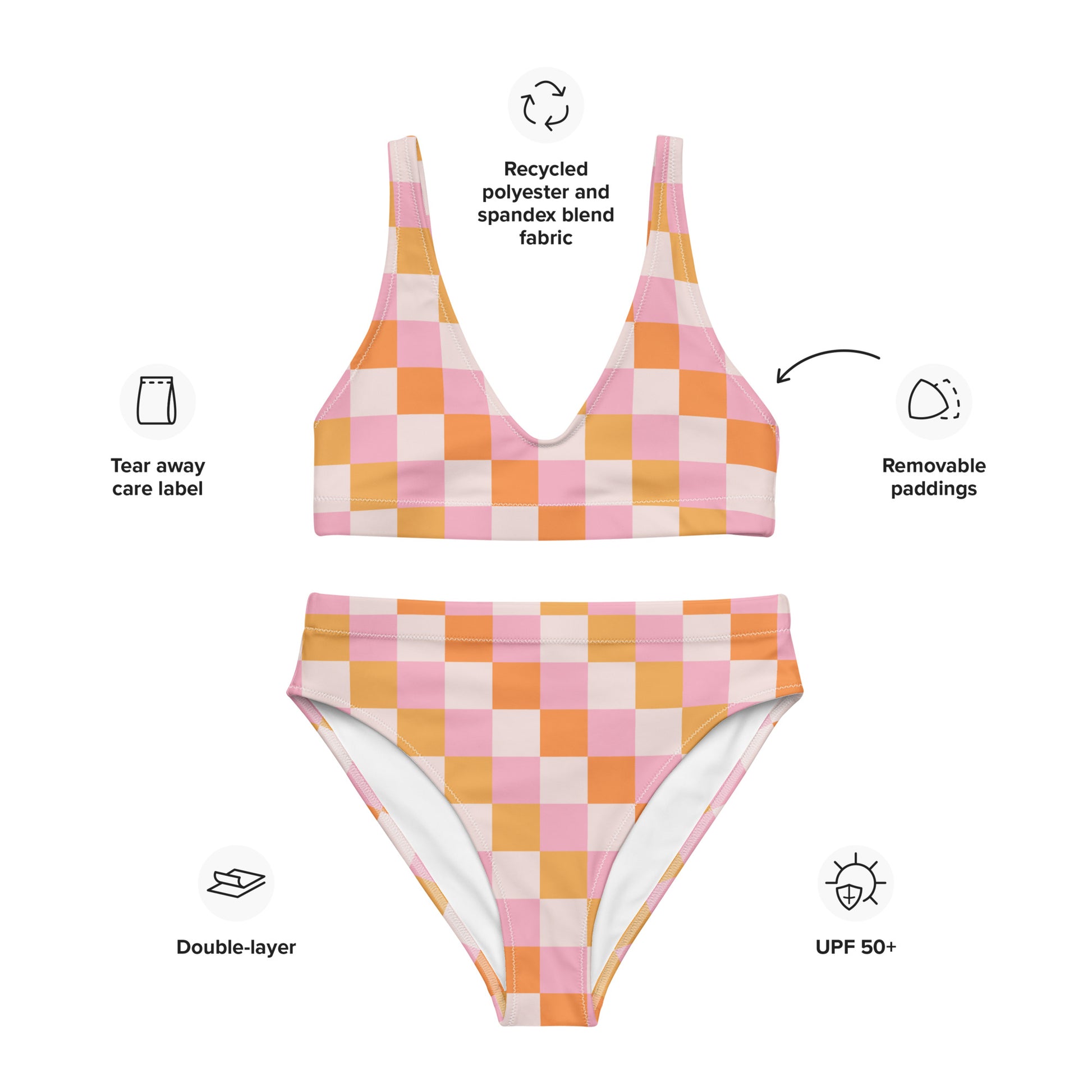 Women's Pastel Pink & Orange Checkerboard Padded Recycled Bikini - Quick Drying Fabric With UPF 50+