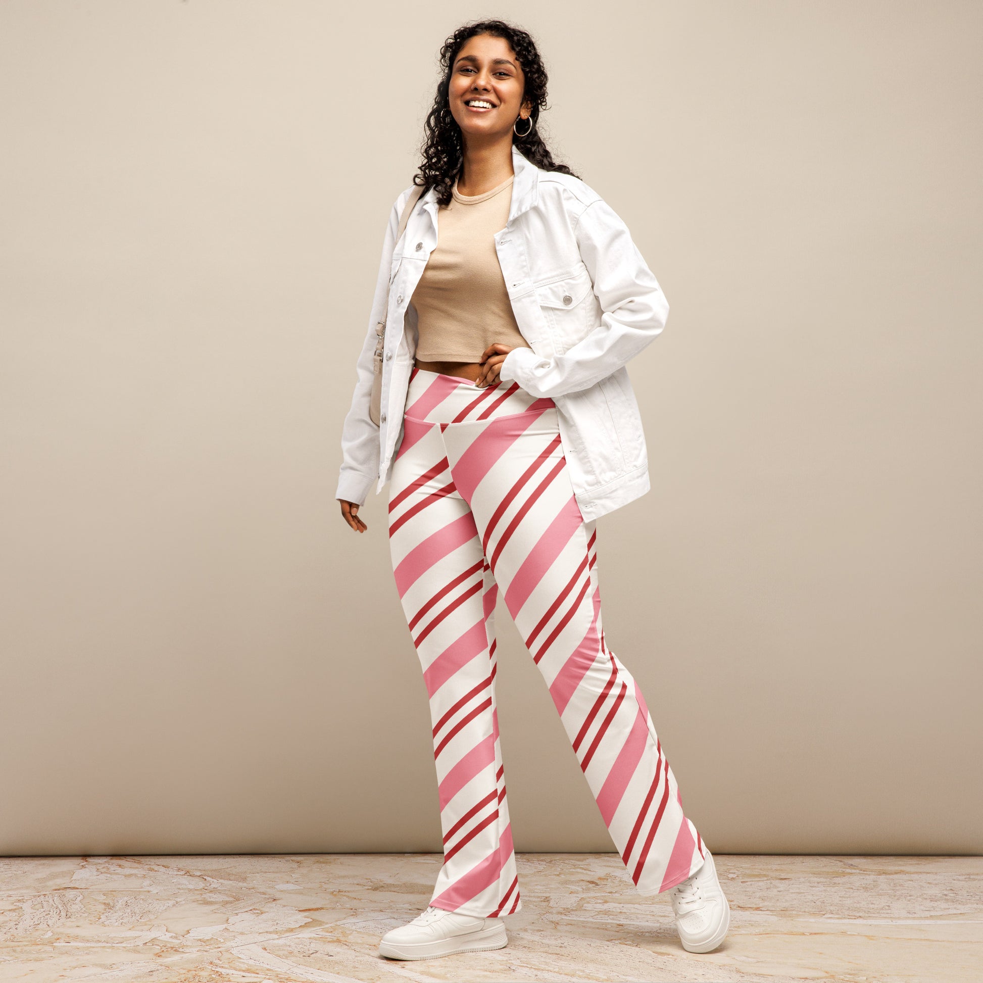 Women's Pink Candy Cane Stripes High Waist Flare Legging Pants