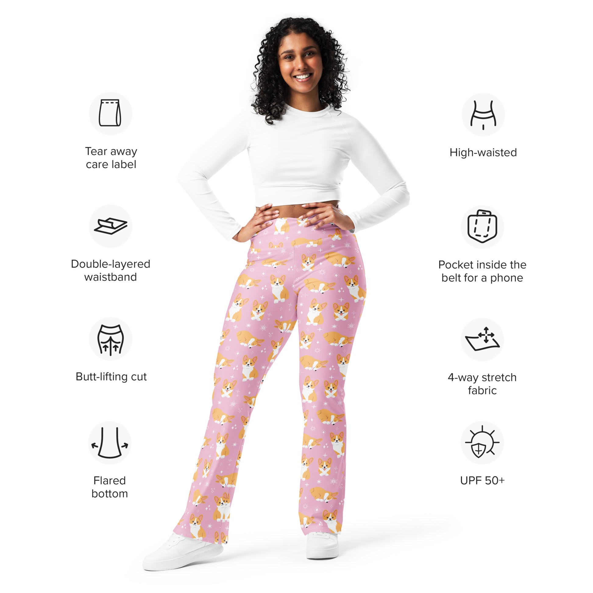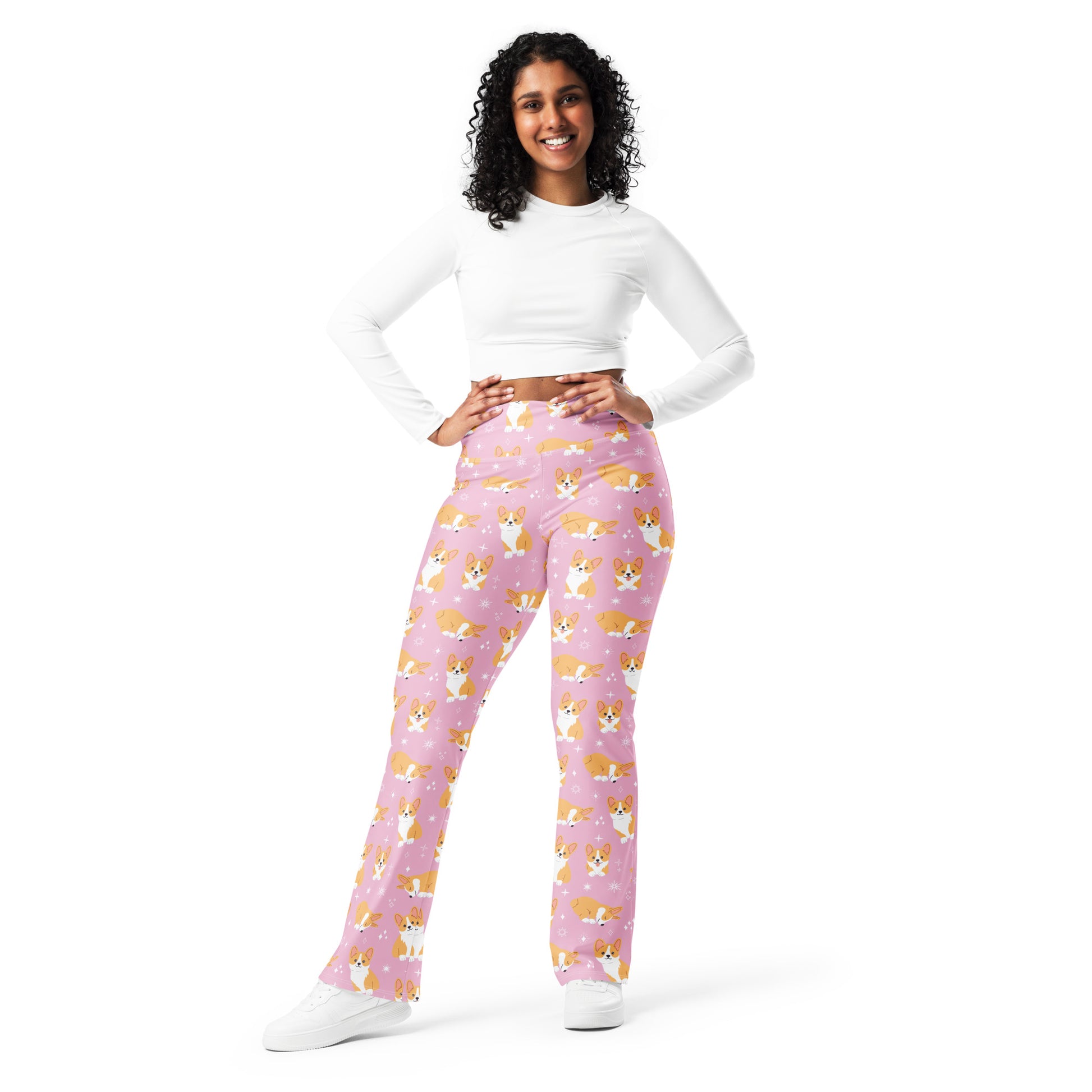 Show off your love for corgis with these women’s pink flare leggings! Featuring an all-over print of happy corgi pups, these leggings are a must-have for dog lovers. The high-rise waistband offers a flattering, supportive fit, while the flared bottoms bring a trendy, retro touch. Perfect for lounging, yoga, dog walks, or casual outfits, they’re comfy, playful, and stylish all in one.