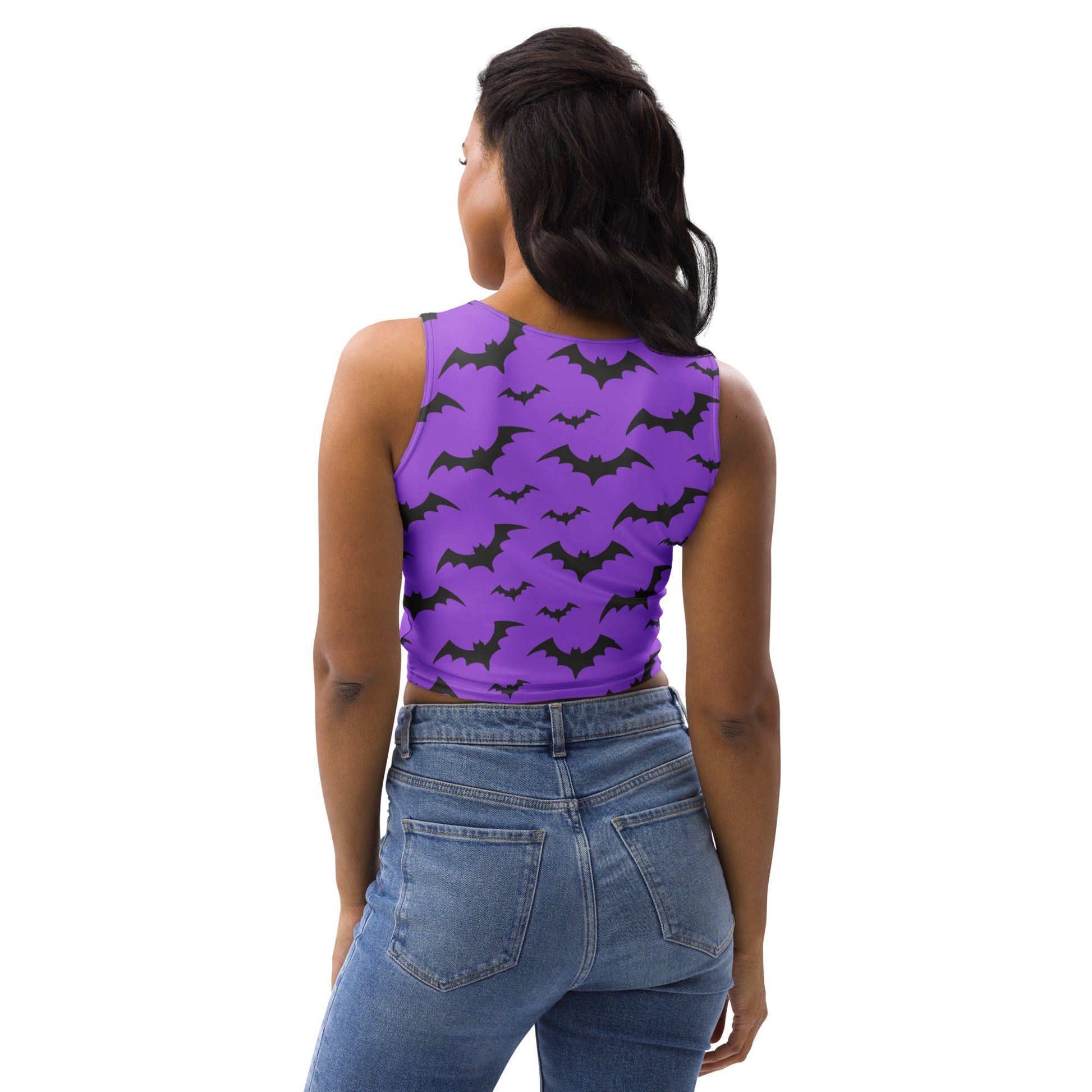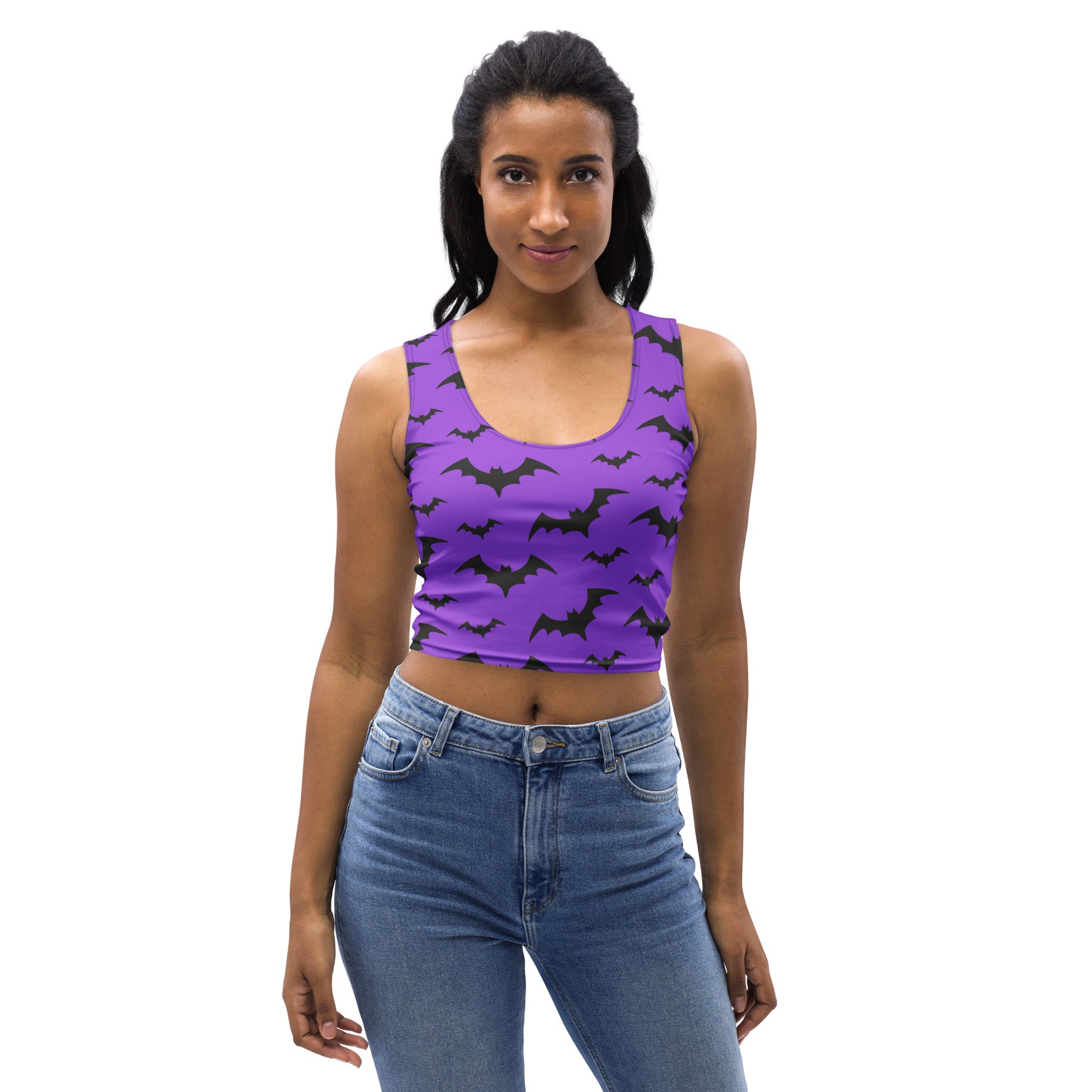 Step into spooky season with this bold Halloween bat crop top, featuring a striking purple background and flying bat design. Perfect for costume parties, haunted houses, or everyday fall style, this Halloween festival top is a fun way to show your love for October nights.