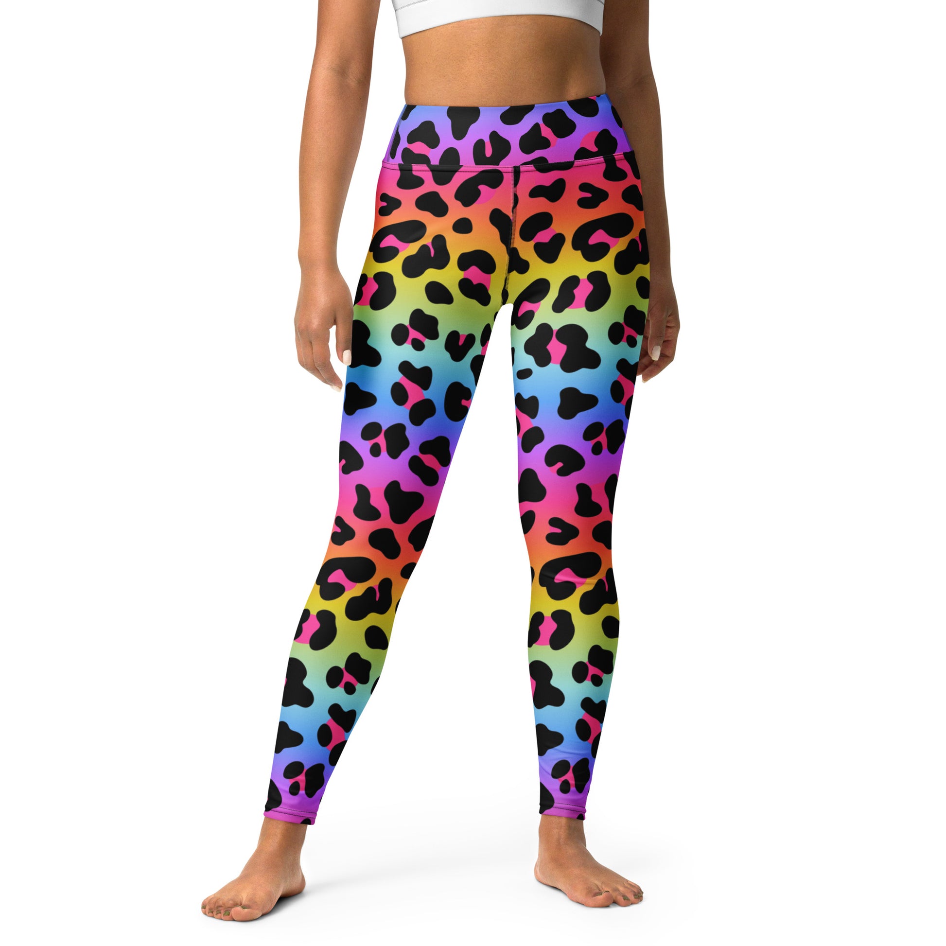 Make every move fierce and fun with these Women's Rainbow Leopard Yoga Leggings. Designed for women who love loud prints and all-day comfort, these leggings feature a bold neon rainbow gradient with classic black leopard spots. The high-rise waistband hugs your core while the buttery-soft microfiber fabric stretches and supports you from morning workouts to late-night lounging.