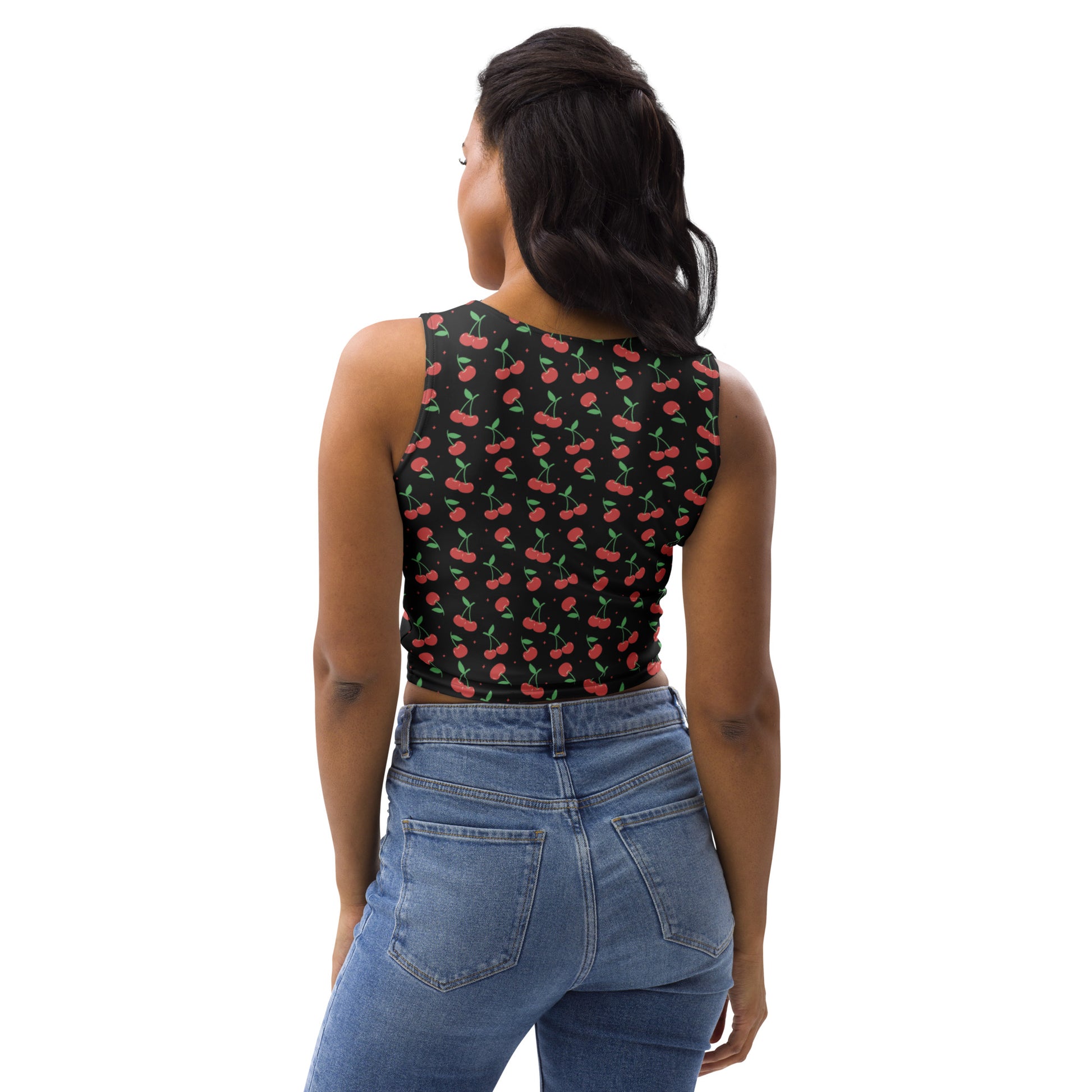 Turn heads with a timeless retro look in this Women’s Cherry Print Crop Top. Featuring a bold black background covered in bright red cherries with green stems, this piece captures classic pin-up and rockabilly vibes while offering modern comfort.
