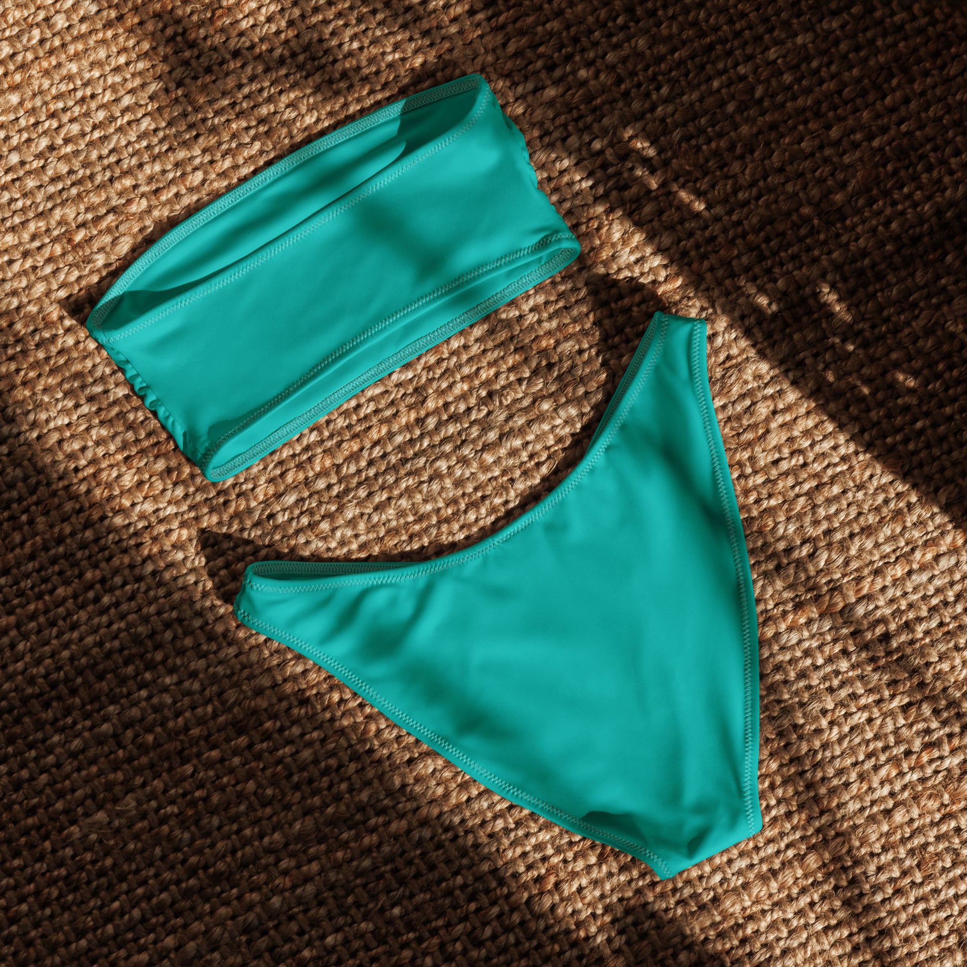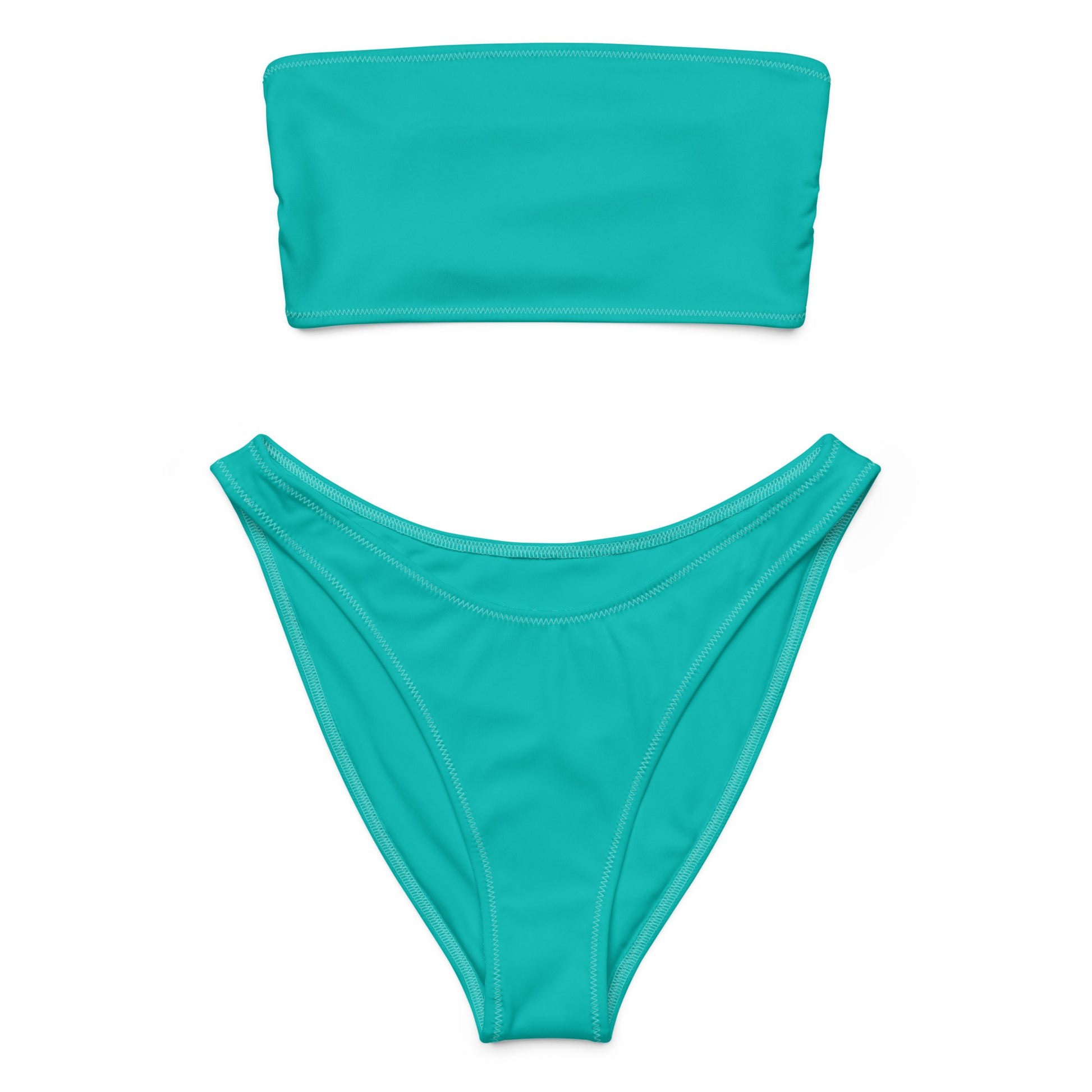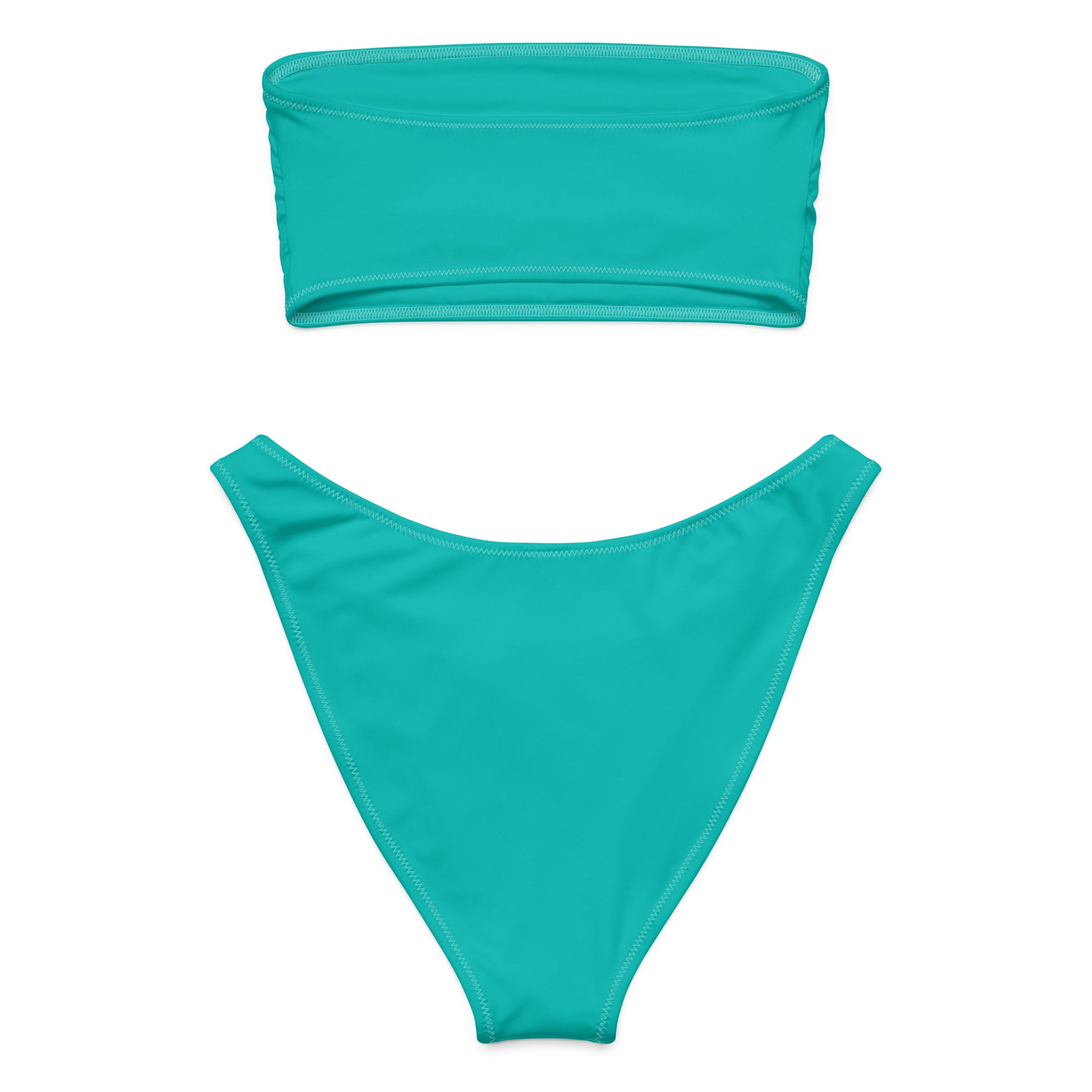 Clean, bold, and built to last—this teal bandeau bikini combines timeless style with modern construction. Designed for a seamless tan and a flawless fit, it features reinforced double stitching that adds durability without sacrificing comfort or stretch.