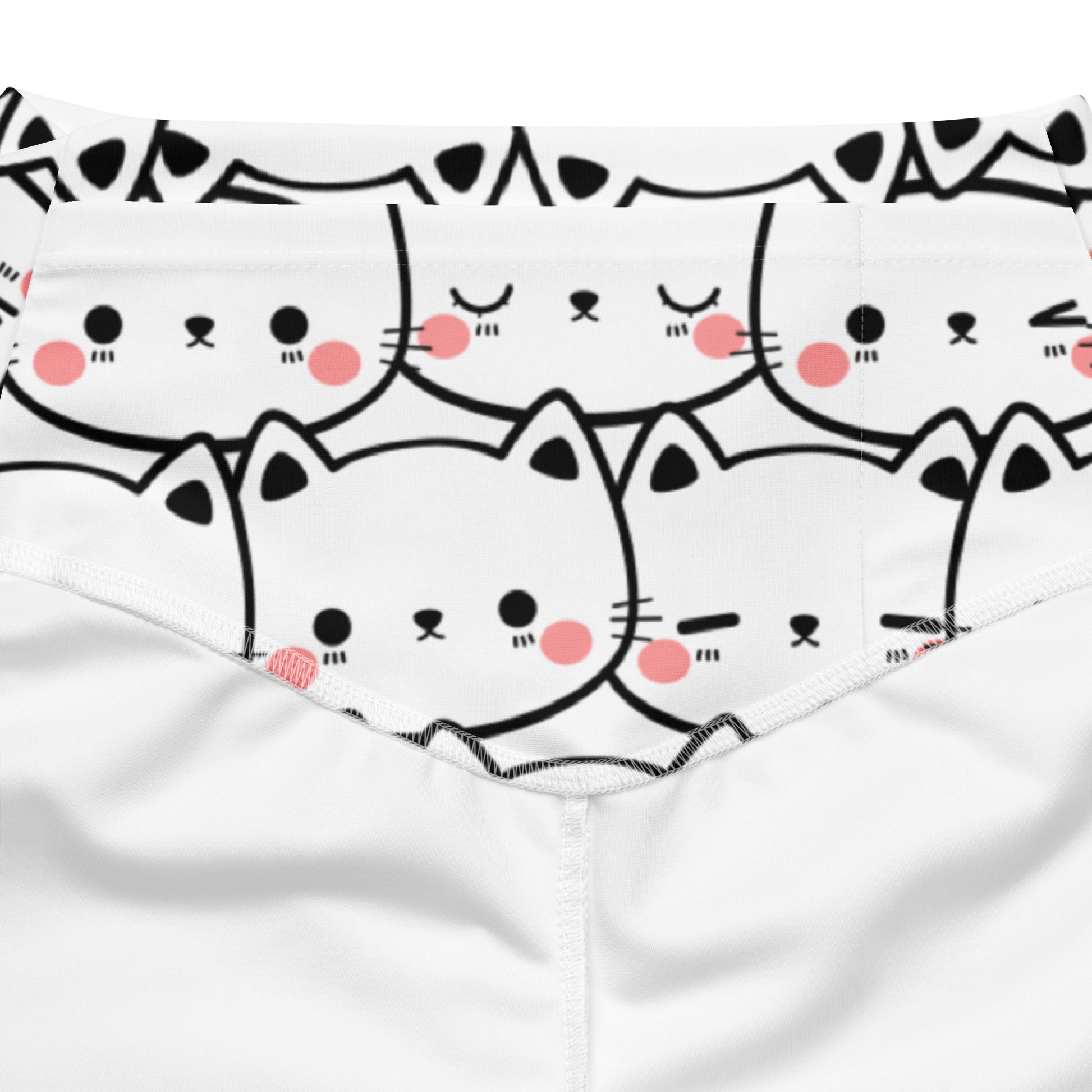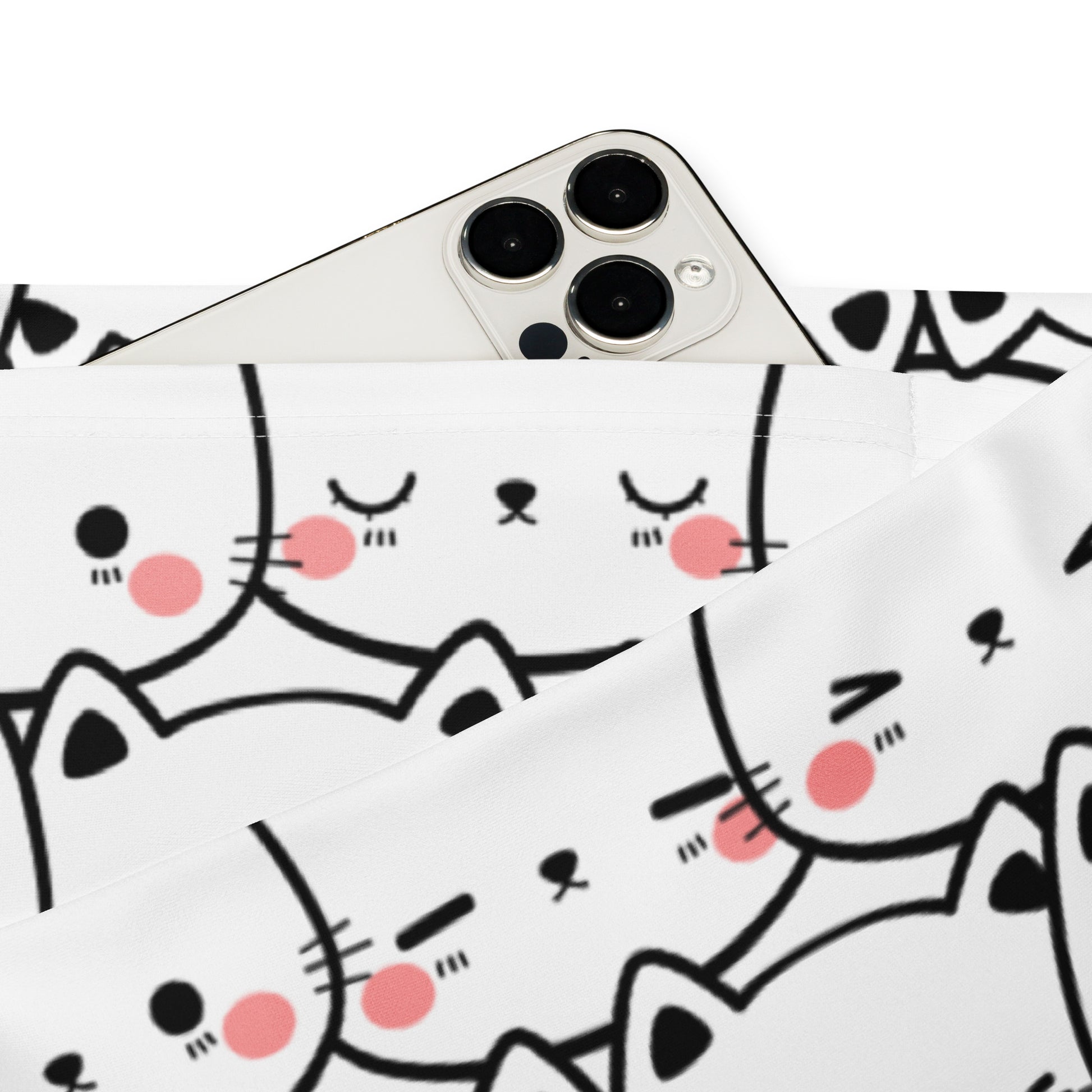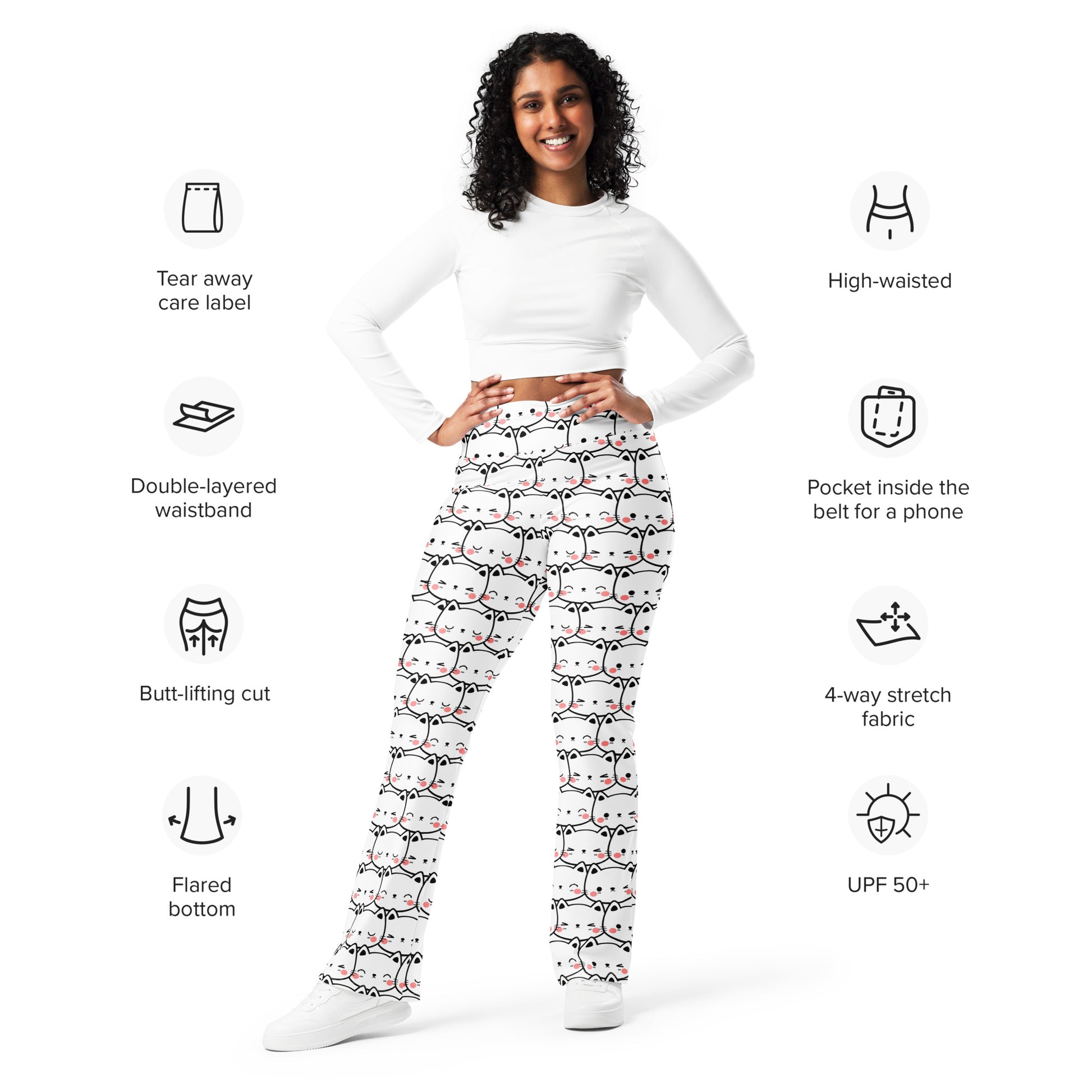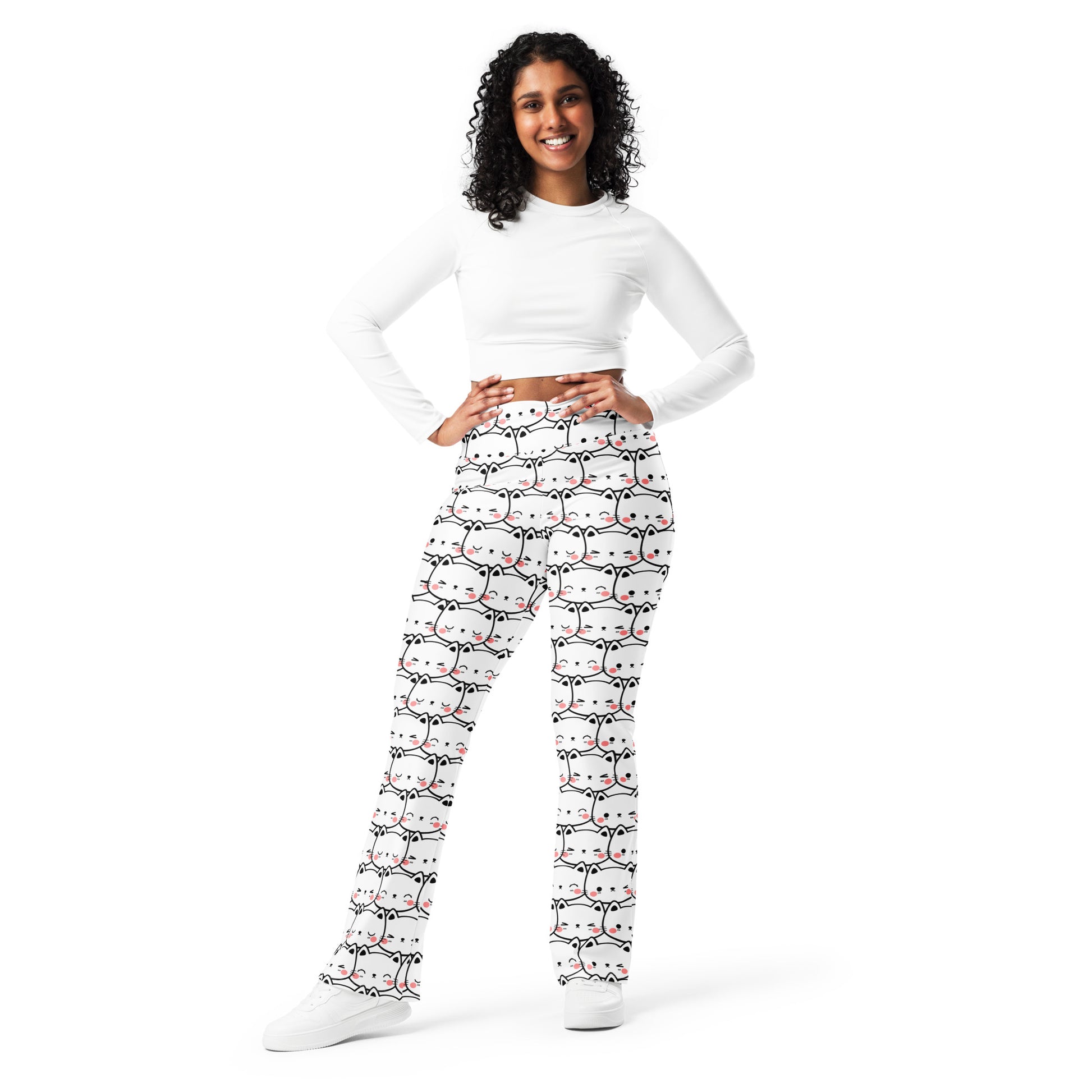 Show off your playful side with these women’s white cat print flare leggings. Featuring an all-over design of kawaii kitty faces with pink blush details, they’re a must-have for animal lovers and fans of cute fashion. The high-rise waistband smooths and flatters, while retro-inspired flared bottoms give them a trendy silhouette. Perfect for lounging, yoga, or casual streetwear, these leggings bring comfort and personality to any outfit.