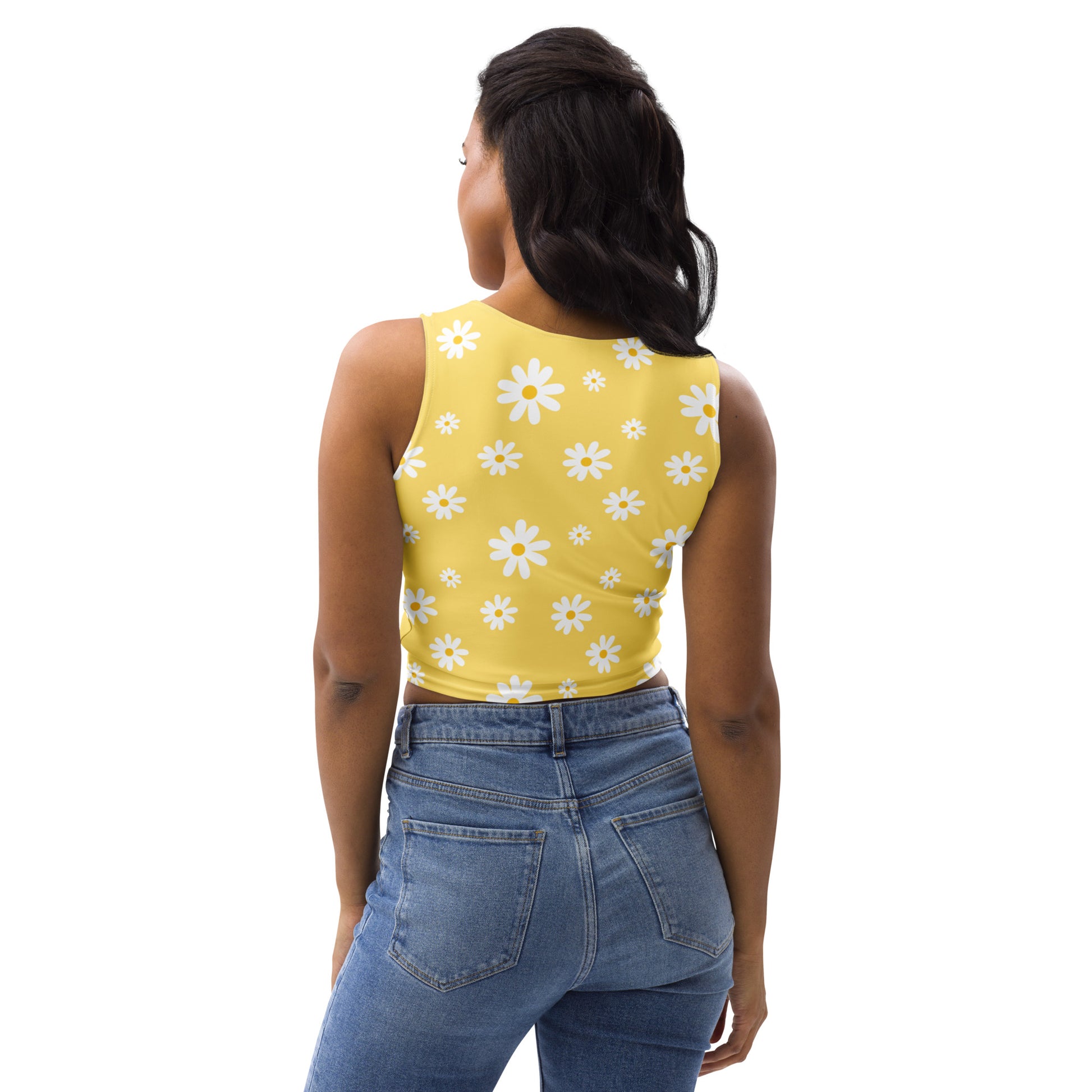Bring sunshine to your wardrobe with this cheerful yellow daisy print crop top. Featuring a playful pattern of white daisies on a bright yellow background, this top is perfect for sunny days, festival fun, workouts, or casual weekends with friends.