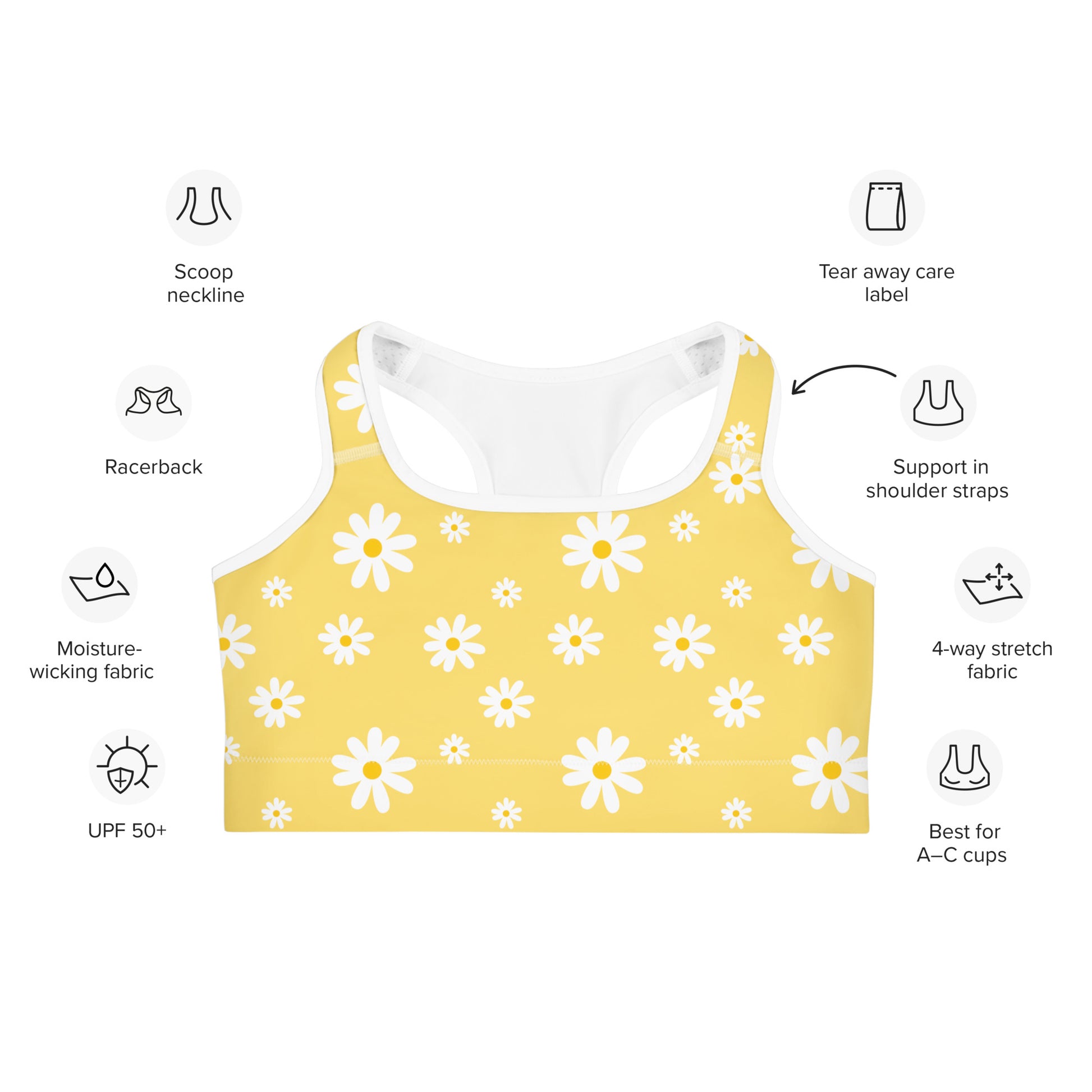 Add a burst of sunshine to your activewear with this cheerful yellow daisy sports bra! Featuring a playful all-over print of white daisies on a buttery yellow background, it’s perfect for spring workouts, summer strolls, or anytime you want to radiate happy vibes and floral flair.
