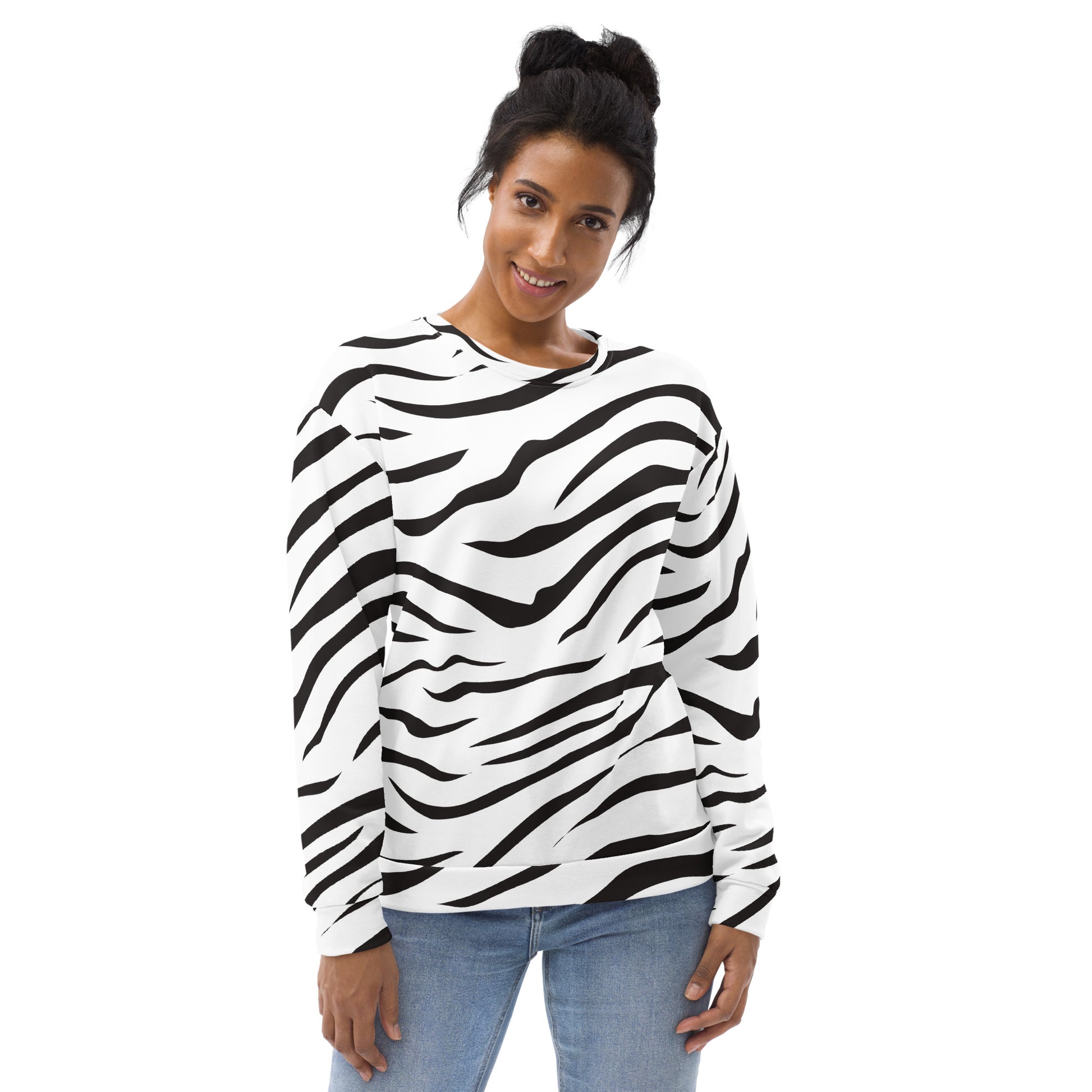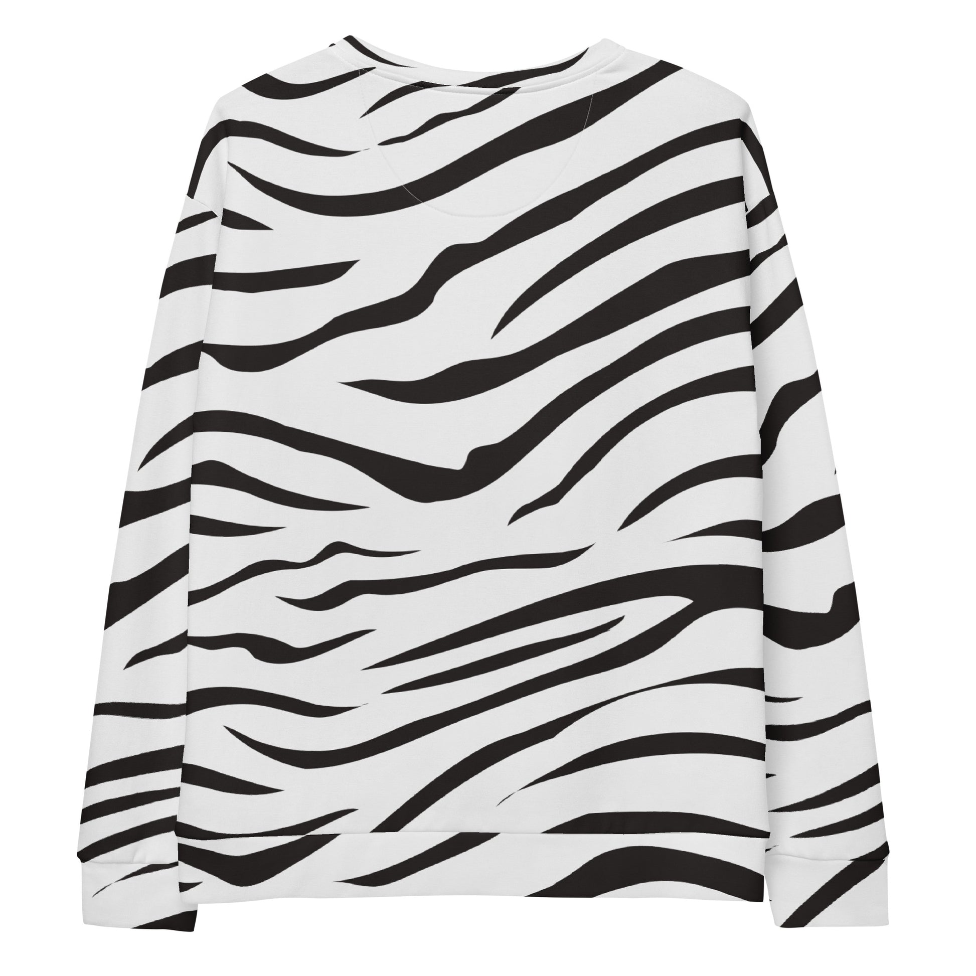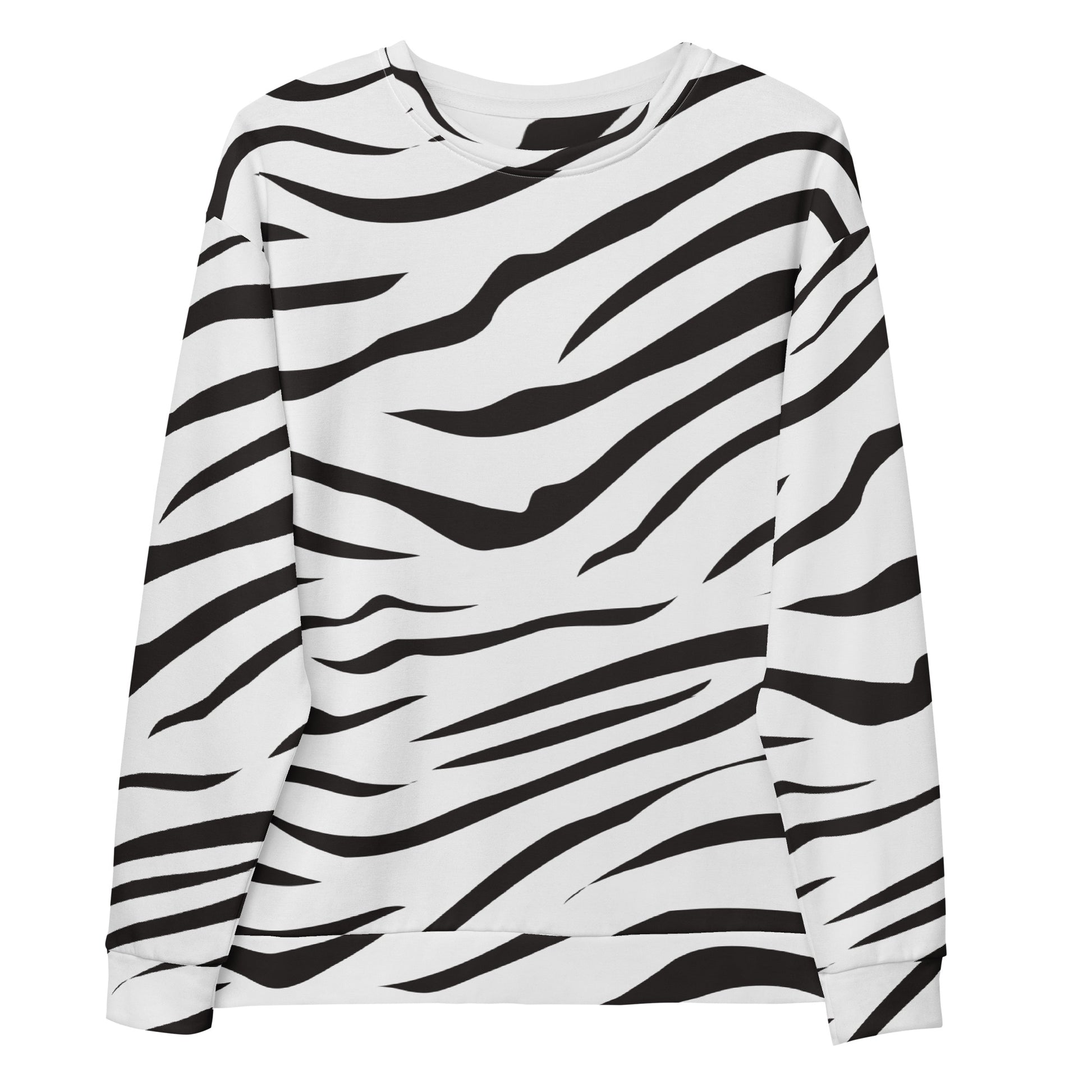 Step out in bold style with this Zebra Print Sweatshirt! Featuring an all-over black and white stripe design, this cozy pullover brings a trendy animal print edge to your everyday wardrobe. Made with eco-friendly recycled polyester and brushed fleece inside, it’s as soft and comfortable as it is eye-catching.
